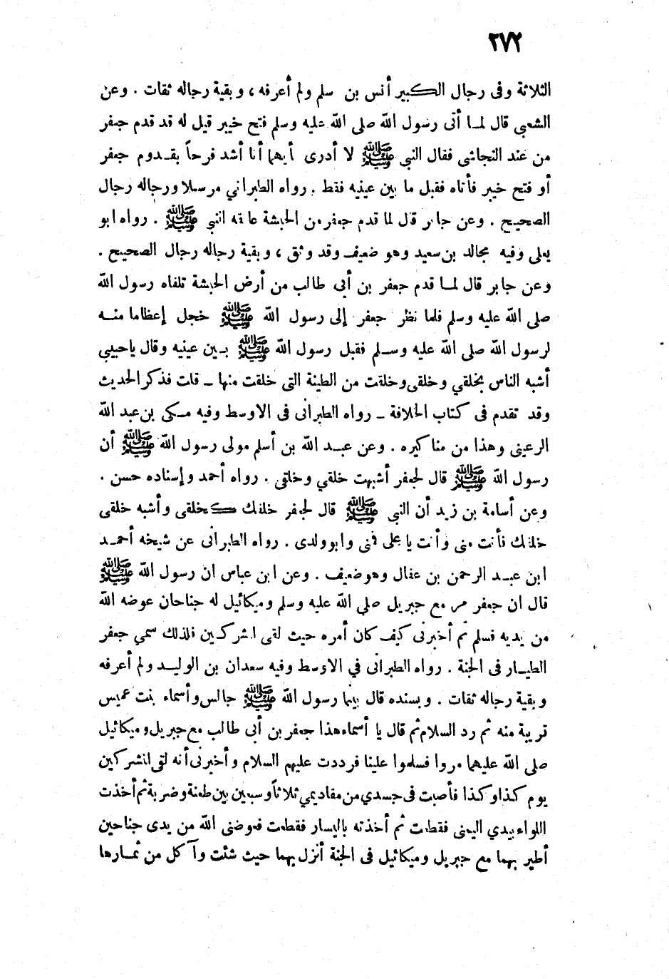 15495 - وَبِسَنَدِهِ قَالَ: «بَيْنَمَا رَسُولُ اللَّهِ - صَلَّى اللَّهُ عَلَيْهِ وَسَلَّمَ - جَالِسٌ وَأَسْمَاءُ بِنْتُ عُمَيْسٍ قَرِيبَةٌ مِنْهُ إِذْ رَدَّ السَّلَامَ، ثُمَّ قَالَ: " يَا أَسْمَاءُ هَذَا جَعْفَرُ بْنُ أَبِي طَالِبٍ مَعَ جِبْرِيلَ وَمِيكَائِيلَ - صَلَّى اللَّهُ عَلَيْهِمَا - مَرُّوا فَسَلَّمُوا عَلَيْنَا، فَرَدَدْتُ عَلَيْهِمُ السَّلَامَ، وَأَخْبَرَنِي أَنَّهُ لَقِيَ الْمُشْرِكِينَ يَوْمَ كَذَا وَكَذَا، فَأُصِبْتُ فِي جَسَدِي مِنْ مَقَادِيمِي ثَلَاثًا وَسَبْعِينَ بَيْنَ طَعْنَةٍ وَضَرْبَةٍ، ثُمَّ أَخَذْتُ اللِّوَاءَ بِيَدِيَ الْيُمْنَى فَقُطِعَتْ، ثُمَّ أَخَذْتُ بِيَدِي الْيُسْرَى فَقُطِعَتْ، فَعَوَّضَنِي اللَّهُ مِنْ يَدَيَّ جَنَاحَيْنِ أَطِيرُ بِهِمَا مَعَ جِبْرِيلَ وَمِيكَائِيلَ فِي الْجَنَّةِ، أَنْزِلُ مِنْهَا حَيْثُ شِئْتُ، وَآكُلُ مِنْ ثِمَارِهَا