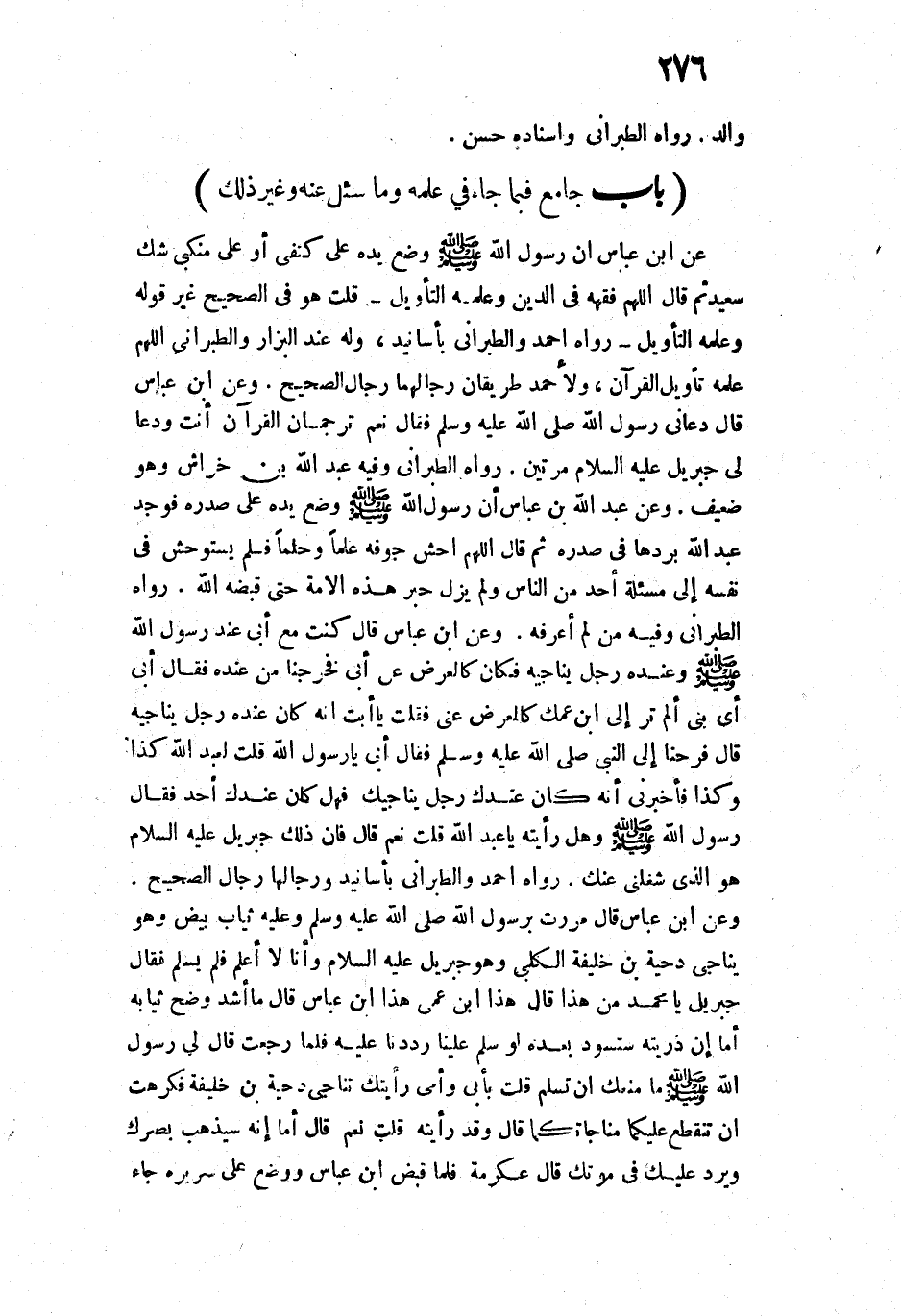 15517 - «وَعَنْ عَبْدِ اللَّهِ بْنِ عَبَّاسٍ أَنَّ رَسُولَ اللَّهِ - صَلَّى اللَّهُ عَلَيْهِ وَسَلَّمَ - وَضَعَ يَدَهُ عَلَى رَأْسِ ابْنِ عَبَّاسٍ فَقَالَ اللَّهُمَّ أَعْطِ الْحِكْمَةَ وَعَلِّمْهُ التَّأْوِيلَ، وَوَضَعَ يَدَهُ عَلَى صَدْرِهِ فَوَجَدَ عَبْدُ اللَّهِ بَرْدَهَا فِي صَدْرِهِ، ثُمَّ قَالَ: " اللَّهُمَّ احْشُ جَوْفَهُ عِلْمًا وَحِلْمًا ". فَلَمْ يَسْتَوْحِشْ فِي نَفْسِهِ إِلَى مَسْأَلَةِ أَحَدٍ مِنَ النَّاسِ، وَلَمْ يَزَلْ حَبْرَ هَذِهِ الْأُمَّةِ حَتَّى قَبَضَهُ اللَّهُ».