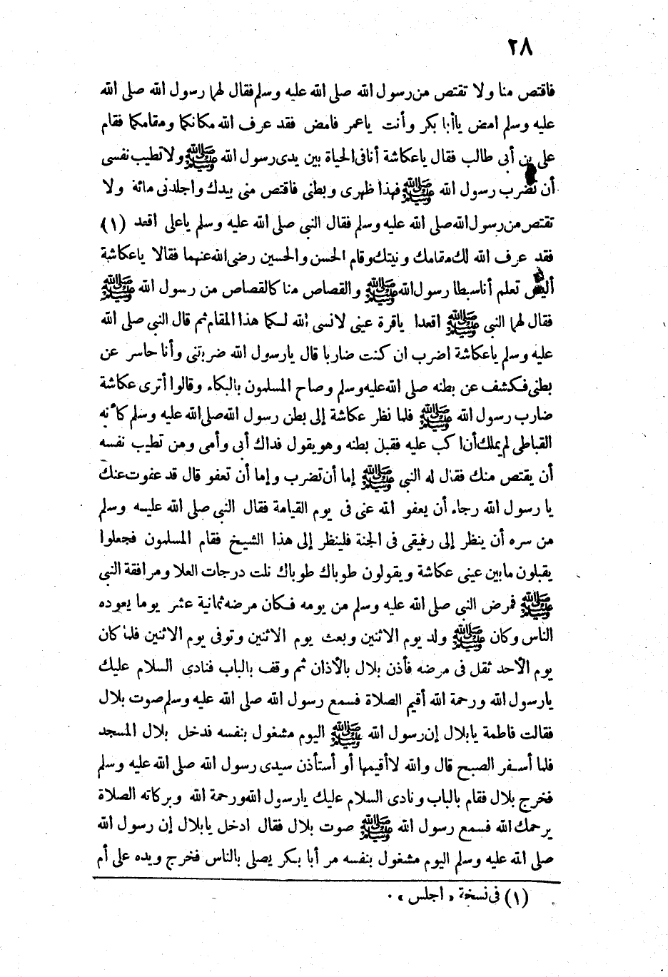 فَاقْتَصَّ مِنَّا، وَلَا تَقْتَصَّ مِنْ رَسُولِ اللَّهِ - صَلَّى اللَّهُ عَلَيْهِ وَسَلَّمَ -. فَقَالَ لَهُمَا رَسُولُ اللَّهِ - صَلَّى اللَّهُ عَلَيْهِ وَسَلَّمَ -: " امْضِ يَا أَبَا بَكْرٍ، وَأَنْتَ يَا عُمَرُ فَامْضِ ; فَقَدْ عَرَفَ اللَّهُ مَكَانَكُمَا وَمَقَامَكُمَا ". فَقَامَ عَلِيُّ بْنُ أَبِي طَالِبٍ فَقَالَ: يَا عُكَّاشَةُ، أَنَا فِي الْحَيَاةِ بَيْنَ يَدَيْ رَسُولِ اللَّهِ - صَلَّى اللَّهُ عَلَيْهِ وَسَلَّمَ - وَلَا تَطِيبُ نَفْسِي أَنْ تَضْرِبَ رَسُولَ اللَّهِ - صَلَّى اللَّهُ عَلَيْهِ وَسَلَّمَ - فَهَذَا ظَهْرِي وَبَطْنِي فَاقْتَصَّ مِنِّي بِيَدِكَ، وَاجْلِدْنِي مِائَةً، وَلَا تَقْتَصَّ مِنْ رَسُولِ اللَّهِ - صَلَّى اللَّهُ عَلَيْهِ وَسَلَّمَ -. فَقَالَ النَّبِيُّ - صَلَّى اللَّهُ عَلَيْهِ وَسَلَّمَ -: " يَا عَلِيُّ، اقْعُدْ ; فَقَدْ عَرَفَ اللَّهُ لَكَ مَقَامَكَ وَنِيَّتَكَ ". وَقَامَ الْحَسَنُ وَالْحُسَيْنُ - رَضِيَ اللَّهُ عَنْهُمَا - فَقَالَا: يَا عُكَّاشَةُ، أَلَيْسَ تَعْلَمُ أَنَّا سِبْطَا رَسُولِ اللَّهِ - صَلَّى اللَّهُ عَلَيْهِ وَسَلَّمَ - وَالْقِصَاصُ مِنَّا كَالْقِصَاصِ مِنْ رَسُولِ اللَّهِ - صَلَّى اللَّهُ عَلَيْهِ وَسَلَّمَ -؟ فَقَالَ لَهُمَا النَّبِيُّ - صَلَّى اللَّهُ عَلَيْهِ وَسَلَّمَ -: " اقْعُدَا يَا قُرَّةَ عَيْنِي، لَا نَسِيَ اللَّهُ لَكَمَا هَذَا الْمَقَامَ ". ثُمَّ قَالَ النَّبِيُّ - صَلَّى اللَّهُ عَلَيْهِ وَسَلَّمَ -: " يَا عُكَّاشَةُ، اضْرِبْ إِنْ كُنْتَ ضَارِبًا ". قَالَ: يَا رَسُولَ اللَّهِ، ضَرَبْتَنِي وَأَنَا حَاسِرٌ عَنْ بَطْنِي. فَكَشَفَ عَنْ بَطْنِهِ - صَلَّى اللَّهُ عَلَيْهِ وَسَلَّمَ - وَصَاحَ الْمُسْلِمُونَ بِالْبُكَاءِ، وَقَالُوا: أَتُرَى عُكَّاشَةُ ضَارِبٌ رَسُولَ اللَّهِ - صَلَّى اللَّهُ عَلَيْهِ وَسَلَّمَ -؟ فَلَمَّا نَظَرَ عُكَّاشَةُ إِلَى بَيَاضِ بَطْنِ رَسُولِ اللَّهِ - صَلَّى اللَّهُ عَلَيْهِ وَسَلَّمَ - كَأَنَّهُ الْقَبَاطِيُّ لَمْ يَمْلِكْ أَنْ أَكَبَّ عَلَيْهِ، فَقَبَّلَ بَطْنَهُ وَهُوَ يَقُولُ: فَدَاكَ أَبِي وَأُمِّي، وَمَنْ تَطِيبُ نَفْسُهُ أَنْ يَقْتَصَّ مِنْكَ؟ فَقَالَ لَهُ النَّبِيُّ - صَلَّى اللَّهُ عَلَيْهِ وَسَلَّمَ -: " إِمَّا أَنْ تَضْرِبَ، وَإِمَّا أَنْ تَعْفُوَ ". قَالَ: قَدْ عَفَوْتُ عَنْكَ يَا رَسُولَ اللَّهِ، رَجَاءَ أَنْ يَعْفُوَ اللَّهُ عَنِّي فِي يَوْمِ الْقِيَامَةِ. فَقَالَ النَّبِيُّ - صَلَّى اللَّهُ عَلَيْهِ وَسَلَّمَ -: " مَنْ سَرَّهُ أَنْ يَنْظُرَ إِلَى رَفِيقِي فِي الْجَنَّةِ فَلْيَنْظُرْ إِلَى هَذَا الشَّيْخِ ". فَقَامَ الْمُسْلِمُونَ، فَجَعَلُوا يُقَبِّلُونَ مَا بَيْنَ عَيْنَيْ عُكَّاشَةَ، وَيَقُولُونَ: طُوبَاكَ! طُوبَاكَ ; نِلْتَ دَرَجَاتِ الْعُلَا، وَمُرَافَقَةَ النَّبِيِّ - صَلَّى اللَّهُ عَلَيْهِ وَسَلَّمَ -. فَمَرِضَ النَّبِيُّ - صَلَّى اللَّهُ عَلَيْهِ وَسَلَّمَ - مِنْ يَوْمِهِ، فَكَانَ مَرَضُهُ ثَمَانِيَةَ عَشَرَ يَوْمًا يَعُودُهُ النَّاسُ، وَكَانَ - صَلَّى اللَّهُ عَلَيْهِ وَسَلَّمَ - وُلِدَ يَوْمَ الِاثْنَيْنِ، وَبُعِثَ يَوْمَ الِاثْنَيْنِ، وَتُوُفِّيَ يَوْمَ الِاثْنَيْنِ. فَلَمَّا كَانَ يَوْمُ الْأَحَدِ ثَقُلَ فِي مَرَضِهِ، فَأَذَّنَ بِلَالٌ بِالْأَذَانِ، ثُمَّ وَقَفَ بِالْبَابِ فَنَادَى: السَّلَامُ عَلَيْكَ يَا رَسُولَ اللَّهِ، وَرَحْمَةُ اللَّهِ أُقِيمُ الصَّلَاةَ؟. فَسَمِعَ رَسُولُ اللَّهِ - صَلَّى اللَّهُ عَلَيْهِ وَسَلَّمَ - صَوْتَ بِلَالٍ، فَقَالَتْ فَاطِمَةُ: يَا بِلَالُ، إِنَّ رَسُولَ اللَّهِ - صَلَّى اللَّهُ عَلَيْهِ وَسَلَّمَ - الْيَوْمَ مَشْغُولٌ بِنَفْسِهِ. فَدَخَلَ بِلَالٌ الْمَسْجِدَ، فَلَمَّا أَسْفَرَ الصُّبْحُ قَالَ: وَاللَّهِ لَا أُقِيمُهَا، أَوْ أَسْتَأْذِنُ سَيِّدِي رَسُولَ اللَّهِ - صَل