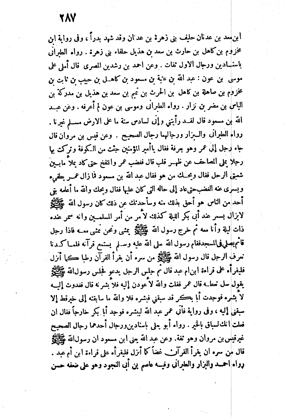 15551 - وَعَنْ قَيْسِ بْنِ مَرْوَانَ قَالَ: «جَاءَ رَجُلٌ إِلَى عُمَرَ وَهُوَ بِعَرَفَةَ، فَقَالَ: يَا أَمِيرَ الْمُؤْمِنِينَ، جِئْتُ مِنَ الْكُوفَةِ وَتَرَكْتُ بِهَا رَجُلًا يُمْلِي الْمَصَاحِفَ عَنْ ظَهْرِ قَلْبٍ. قَالَ: فَغَضِبَ عُمَرُ، وَانْتَفَخَ حَتَّى كَادَ يَمْلَأُ مَا بَيْنَ شُعْبَتَيِ الرَّحْلِ، فَقَالَ: وَيْحَكَ! مَنْ هُوَ؟ فَقَالَ: عَبْدُ اللَّهِ بْنُ مَسْعُودٍ، فَمَا زَالَ عُمَرُ يُطْفِئُ وَيُسَرِّي عَنْهُ الْغَضَبَ حَتَّى عَادَ إِلَى حَالِهِ الَّتِي كَانَ عَلَيْهَا، فَقَالَ: وَيْحَكَ! وَاللَّهِ مَا أَعْلَمُهُ بَقِيَ أَحَدٌ مِنَ النَّاسِ هُوَ أَحَقُّ بِذَلِكَ مِنْهُ، وَسَأُحَدِّثُكَ عَنْ ذَلِكَ: كَانَ رَسُولُ اللَّهِ - صَلَّى اللَّهُ عَلَيْهِ وَسَلَّمَ - لَا يَزَالُ يَسْمُرُ عِنْدَ أَبِي بَكْرٍ اللَّيْلَةَ كَذَلِكَ لِأَمْرٍ مِنْ أَمْرِ الْمُسْلِمِينَ، وَإِنَّهُ سَمَرَ عِنْدِهِ ذَاتَ لَيْلَةٍ وَأَنَا مَعَهُ، ثُمَّ خَرَجَ رَسُولُ اللَّهِ - صَلَّى اللَّهُ عَلَيْهِ وَسَلَّمَ - يَمْشِي وَنَحْنُ نَمْشِي مَعَهُ، فَإِذَا رَجُلٌ قَائِمٌ يُصَلِّي فِي الْمَسْجِدِ، فَقَامَ رَسُولُ اللَّهِ - صَلَّى اللَّهُ عَلَيْهِ وَسَلَّمَ - يَسْتَمِعُ قِرَاءَتَهُ، فَلَمَّا كِدْنَا نَعْرِفُ الرَّجُلَ قَالَ رَسُولُ اللَّهِ - صَلَّى اللَّهُ عَلَيْهِ وَسَلَّمَ -: " مَنْ سَرَّهُ أَنْ يَقْرَأَ الْقُرْآنَ رَطْبًا كَمَا أُنْزِلَ فَلْيَقْرَأْهُ عَلَى قِرَاءَةِ ابْنِ أُمِّ عَبْدٍ ". قَالَ: ثُمَّ جَلَسَ الرَّجُلُ يَدْعُو، فَجَلَسَ رَسُولُ اللَّهِ - صَلَّى اللَّهُ عَلَيْهِ وَسَلَّمَ - يَقُولُ: " سَلْ تُعْطَهُ ". قَالَ عُمَرُ: فَقُلْتُ: وَاللَّهِ لَأَعُودَنَّ إِلَيْهِ فَلَأُبَشِّرَنَّهُ. قَالَ: فَغَدَوْتُ إِلَيْهِ لِأُبَشِّرَهُ، فَوَجَدْتُ أَبَا بَكْرٍ قَدْ سَبَقَنِي فَبَشَّرَهُ، فَلَا وَاللَّهِ مَا سَابَقْتُهُ إِلَى خَيْرٍ قَطُّ إِلَّا سَبَقَنِي إِلَيْهِ».