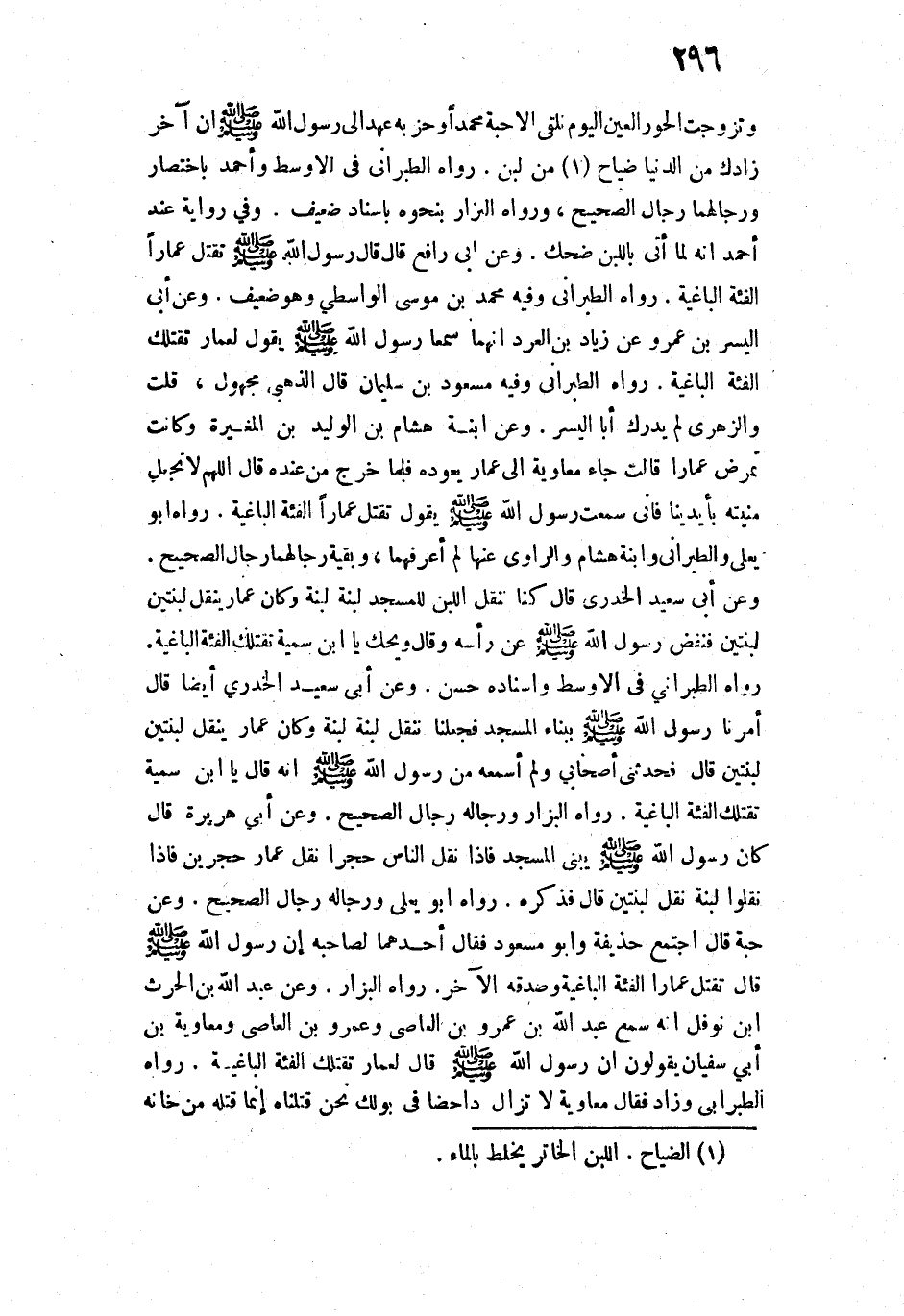 15613 - «وَعَنِ ابْنَةِ هِشَامِ بْنِ الْوَلِيدِ بْنِ الْمُغِيرَةِ - وَكَانَتْ تُمَرِّضُ عَمَّارًا - قَالَتْ: جَاءَ مُعَاوِيَةُ إِلَى عَمَّارٍ يَعُودُهُ، فَلَمَّا خَرَجَ مِنْ عِنْدِهِ قَالَ: اللَّهُمَّ لَا تَجْعَلْ مَنِيَّتَهُ بِأَيْدِينَا، فَإِنِّي سَمِعْتُ رَسُولَ اللَّهِ - صَلَّى اللَّهُ عَلَيْهِ وَسَلَّمَ - يَقُولُ: " تَقْتُلُ عَمَّارًا الْفِئَةُ الْبَاغِيَةُ "».