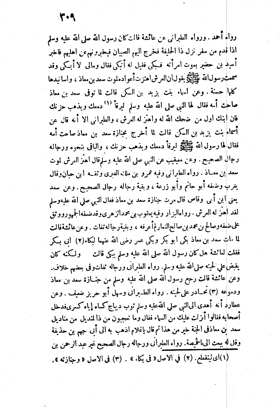 رَوَاهُ [أَحْمَدُ] الطَّبَرَانِيُّ إِلَّا أَنَّهُ قَالَ: عَنْ أَسْمَاءَ بِنْتِ يَزِيدَ بْنِ السَّكَنِ قَالَتْ: «لَمَّا أُخْرِجَ بِجِنَازَةِ سَعْدِ بْنِ مُعَاذٍ صَاحَتْ أُمُّهُ، فَقَالَ لَهَا رَسُولُ اللَّهِ - صَلَّى اللَّهُ عَلَيْهِ وَسَلَّمَ -: " لِيَرْقَأْ دَمْعُكِ، وَيَذْهَبْ حُزْنُكِ». وَالْبَاقِي بِنَحْوِهِ، وَرِجَالُهُ رِجَالُ الصَّحِيحِ.
