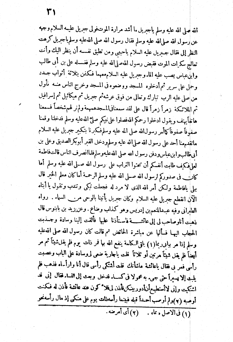 - صَلَّى اللَّهُ عَلَيْهِ وَسَلَّمَ -: " يَا جِبْرِيلُ، مَا أَشَدَّ مَرَارَةَ الْمَوْتِ ". فَوَلَّى جِبْرِيلُ - عَلَيْهِ السَّلَامُ - وَجْهَهُ عَنْ رَسُولِ اللَّهِ - صَلَّى اللَّهُ عَلَيْهِ وَسَلَّمَ - فَقَالَ رَسُولُ اللَّهِ - صَلَّى اللَّهُ عَلَيْهِ وَسَلَّمَ -: " يَا جِبْرِيلُ، كَرِهْتَ النَّظَرَ إِلَيَّ؟ ". فَقَالَ جِبْرِيلُ - عَلَيْهِ السَّلَامُ -: يَا حَبِيبِي، وَمَنْ تُطِيقُ نَفْسُهُ أَنْ يَنْظُرَ إِلَيْكَ وَأَنْتَ تُعَالِجُ سَكَرَاتِ الْمَوْتِ؟ فَقُبِضَ رَسُولُ اللَّهِ - صَلَّى اللَّهُ عَلَيْهِ وَسَلَّمَ - فَغَسَّلَهُ عَلِيُّ بْنُ أَبِي طَالِبٍ، وَابْنُ عَبَّاسٍ يَصُبُّ عَلَيْهِ الْمَاءَ، وَجِبْرِيلُ - عَلَيْهِ السَّلَامُ - مَعَهُمَا، فَكُفِّنَ بِثَلَاثَةِ أَثْوَابٍ جُدُدٍ، وَحُمِلَ عَلَى سَرِيرٍ، ثُمَّ أَدْخَلُوهُ الْمَسْجِدَ وَوَضَعُوهُ فِي الْمَسْجِدِ، وَخَرَجَ النَّاسُ مِنْهُ. فَأَوَّلُ مَنْ صَلَّى عَلَيْهِ الرَّبُّ - تَبَارَكَ وَتَعَالَى - مِنْ فَوْقِ عَرْشِهِ، ثُمَّ جِبْرِيلُ، ثُمَّ مِيكَائِيلُ، ثُمَّ إِسْرَافِيلُ، ثُمَّ الْمَلَائِكَةُ زُمَرًا زُمَرًا. قَالَ عَلِيٌّ: لَقَدْ سَمِعْنَا فِي الْمَسْجِدِ هَمْهَمَةً وَلَمْ نَرَ لَهُمْ شَخْصًا ; فَسَمِعْنَا هَاتِفًا يَهْتِفُ وَيَقُولُ: ادْخُلُوا رَحِمَكُمُ اللَّهُ، فَصَلُّوا عَلَى نَبِيِّكُمْ - صَلَّى اللَّهُ عَلَيْهِ وَسَلَّمَ - فَدَخَلْنَا، وَقُمْنَا صُفُوفًا صُفُوفًا كَمَا أَمَرَ رَسُولُ اللَّهِ - صَلَّى اللَّهُ عَلَيْهِ وَسَلَّمَ - فَكَبَّرْنَا بِتَكْبِيرِ جِبْرِيلَ - عَلَيْهِ السَّلَامُ - وَصَلَّيْنَا عَلَى رَسُولِ اللَّهِ صَلَّى اللَّهُ عَلَيْهِ وَسَلَّمَ بِصَلَاةِ جِبْرِيلَ عَلَيْهِ السَّلَامُ، مَا تَقَدَّمَ مِنَّا أَحَدٌ عَلَى رَسُولِ اللَّهِ - صَلَّى اللَّهُ عَلَيْهِ وَسَلَّمَ - وَدَخَلَ الْقَبْرَ أَبُو بَكْرٍ الصِّدِّيقُ، وَعَلِيُّ بْنُ أَبِي طَالِبٍ، وَابْنُ عَبَّاسٍ، وَدُفِنَ رَسُولُ اللَّهِ - صَلَّى اللَّهُ عَلَيْهِ وَسَلَّمَ -. فَلَمَّا انْصَرَفَ النَّاسُ قَالَتْ فَاطِمَةُ لِعَلِيٍّ: يَا أَبَا الْحَسَنِ: دَفَنْتُمْ رَسُولَ اللَّهِ صَلَّى اللَّهُ عَلَيْهِ وَسَلَّمَ؟ قَالَ: نَعَمْ. قَالَتْ فَاطِمَةُ رَضِيَ اللَّهُ عَنْهَا: كَيْفَ طَابَتْ أَنْفُسُكُمُ أَنْ تَحْثُوا التُّرَابَ عَلَى رَسُولِ اللَّهِ - صَلَّى اللَّهُ عَلَيْهِ وَسَلَّمَ -؟ أَمَا كَانَ فِي صُدُورِكُمْ لِرَسُولِ اللَّهِ - صَلَّى اللَّهُ عَلَيْهِ وَسَلَّمَ - الرَّحْمَةُ؟ أَمَا كَانَ مُعَلِّمَ الْخَيْرِ؟ قَالَ: بَلَى يَا فَاطِمَةُ، وَلَكِنْ أَمْرُ اللَّهِ الَّذِي لَا مَرَدَّ لَهُ. فَجَعَلَتْ تَبْكِي وَتَنْدُبُ، وَتَقُولُ: يَا أَبَتَاهُ، الْآنَ انْقَطَعَ جِبْرِيلُ - عَلَيْهِ السَّلَامُ - وَكَانَ جِبْرِيلُ يَأْتِينَا بِالْوَحْيِ مِنَ السَّمَاءِ».