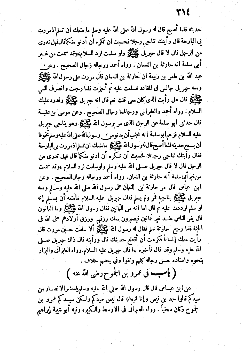 15739 - وَعَنْ عَبْدِ اللَّهِ بْنِ عَامِرِ بْنِ رَبِيعَةَ: أَنَّ حَارِثَةَ بْنَ النُّعْمَانِ قَالَ: «مَرَرْتُ عَلَى رَسُولِ اللَّهِ - صَلَّى اللَّهُ عَلَيْهِ وَسَلَّمَ - وَمَعَهُ جِبْرِيلُ فِي جَالِسٌ الْمَقَاعِدِ، فَسَلَّمْتُ عَلَيْهِ ثُمَّ أَجَزْتُ، فَلَمَّا رَجَعْتُ وَانْصَرَفَ النَّبِيُّ - صَلَّى اللَّهُ عَلَيْهِ وَسَلَّمَ - قَالَ: " هَلْ رَأَيْتَ الَّذِي كَانَ مَعِي؟ ". قُلْتُ: نَعَمْ قَالَ: " إِنَّهُ جِبْرِيلُ - صَلَّى اللَّهُ عَلَيْهِ وَسَلَّمَ - وَقَدْ رَدَّ عَلَيْكَ السَّلَامَ».