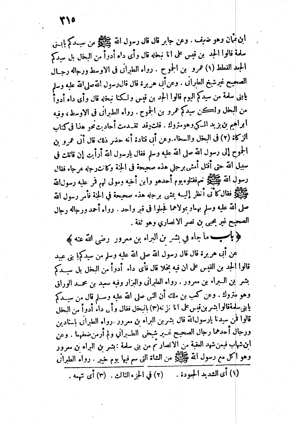 15747 - عَنْ أَبِي هُرَيْرَةَ قَالَ: قَالَ رَسُولُ اللَّهِ - صَلَّى اللَّهُ عَلَيْهِ وَسَلَّمَ -: «مَنْ سَيِّدُكُمْ يَا بَنِي عُبَيْدٍ؟ ". قَالُوا: الْجَدُّ بْنُ الْقَيْسِ، عَلَى أَنَّ فِيهِ بُخْلًا. قَالَ: " فَأَيُّ دَاءٍ أَدْوَأُ مِنَ الْبُخْلِ؟! بَلْ سَيِّدُكُمْ بِشْرُ بْنُ الْبَرَاءِ بْنِ مَعْرُورٍ».
