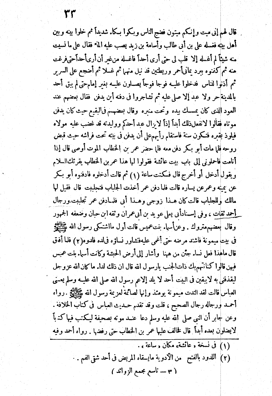 فَلَمَّا مَاتَ أَبُو بَكْرٍ دُفِنَ مَعَهُ، فَلَمَّا حَضَرَ عُمَرُ بْنُ الْخَطَّابِ الْمَوْتَ أَوْصَى قَالَ: إِذَا أَنَا مِتُّ فَاحْمِلُونِي إِلَى بَابِ بَيْتِ عَائِشَةَ، فَقُولُوا لَهَا: هَذَا عُمَرُ بْنُ الْخَطَّابِ يُقْرِئُكِ السَّلَامَ، وَيَقُولُ: أَدْخُلُ أَوْ أَخْرُجُ؟ قَالَ: فَسَكَتَتْ سَاعَةً، ثُمَّ قَالَتْ: أَدْخِلُوهُ فَادْفِنُوهُ، أَبُو بَكْرٍ عَنْ يَمِينِهِ وَعُمَرُ عَنْ يَسَارِهِ. قَالَتْ: فَلَمَّا دُفِنَ عُمَرُ أَخَذَتِ الْجِلْبَابَ فَتَجَلْبَبَتْ بِهِ. قَالَ: فَقِيلَ لَهَا: مَا لَكِ وَلِلْجِلْبَابِ؟ قَالَتْ: كَانَ هَذَا زَوْجِي، وَهَذَا أَبِي، فَلَمَّا دُفِنَ عُمَرُ تَجَلْبَبْتُ».