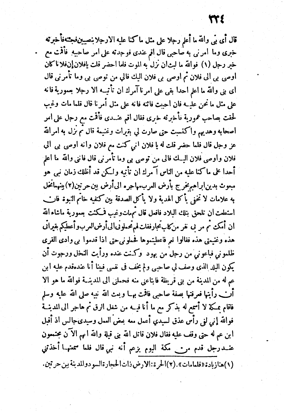 قَالَ: فَلَمَّا مَاتَ وَغُيِّبَ لَحِقْتُ بِصَاحِبِ عَمُّورِيَّةَ، فَأَخْبَرْتُهُ خَبَرِي، فَقَالَ: أَقِمْ عِنْدِي، فَأَقَمْتُ مَعَ رَجُلٍ عَلَى أَمْرِ أَصْحَابِهِ وَهَدْيِهِمْ، وَاكْتَسَبْتُ حَتَّى صَارَتْ لِي بُقَيْرَاتٌ وَغُنَيْمَةٌ. قَالَ: ثُمَّ نَزَلَ بِهِ أَمْرُ اللَّهِ - عَزَّ وَجَلَّ -. قَالَ: فَلَمَّا حَضَرَ قُلْتُ لَهُ: يَا فُلَانُ، إِنِّي كُنْتُ مَعَ فُلَانٍ وَإِنَّهُ أَوْصَى بِي إِلَى فُلَانٍ، وَأَوْصَى إِلَى فُلَانٍ وَأَوْصَى إِلَى فُلَانٍ إِلَى فُلَانٍ وَأَوْصَانِي فُلَانٌ إِلَى فُلَانٌ إِلَيْكَ، فَإِلَى مَنْ تُوصِي بِي؟ وَمَا تَأْمُرُنِي؟ قَالَ: فَإِنَّنِي وَاللَّهِ مَا أَعْلَمُ أَحَدًا عَلَى مَا كُنَّا عَلَيْهِ مِنَ النَّاسِ آمُرُكَ أَنْ تَأْتِيَهُ، وَلَكِنْ قَدْ أَظَلَّكَ زَمَانُ نَبِيٍّ هُوَ مَبْعُوثٌ بِدِينِ إِبْرَاهِيمَ يَخْرُجُ بِأَرْضِ الْعَرَبِ، مُهَاجَرُهُ إِلَى أَرْضٍ بَيْنَ حَرَّتَيْنِ، بَيْنَهُمَا نَخْلٌ، بِهِ عَلَامَاتٌ لَا تَخْفَى: يَأْكُلُ الْهَدِيَّةَ وَلَا يَأْكُلُ الصَّدَقَةَ، بَيْنَ كَتِفَيْهِ خَاتَمُ النُّبُوَّةِ، فَإِنِ اسْتَطَعْتَ أَنْ تَلْحَقَ بِتِلْكَ الْبِلَادِ فَافْعَلْ.