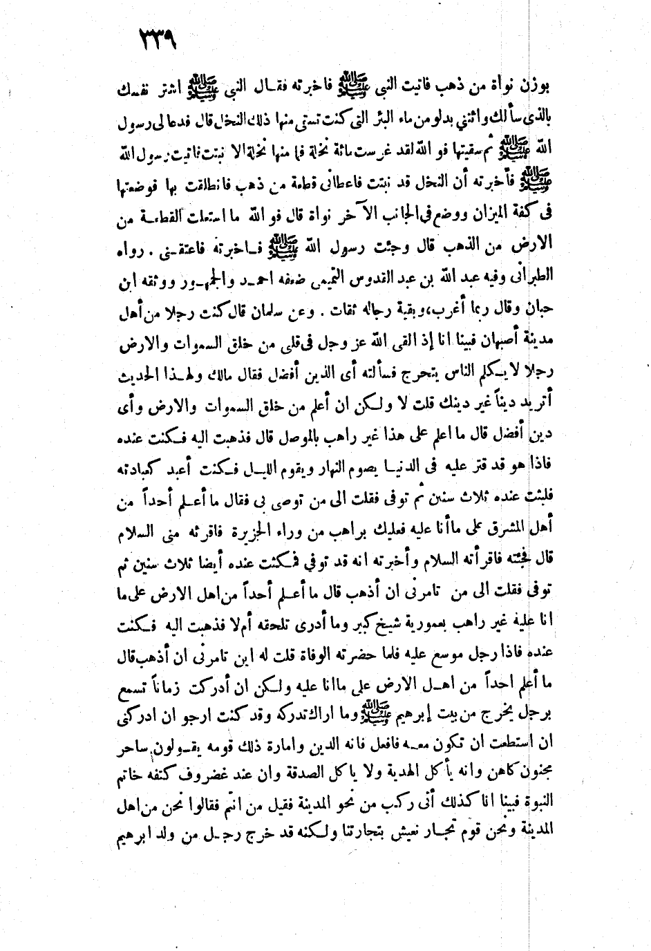 قَالَ: فَذَهَبْتُ إِلَيْهِ فَسَكَنْتُ عِنْدَهُ، فَإِذَا هُوَ قَدْ قُتِّرَ عَلَيْهِ فِي الدُّنْيَا، فَكَانَ يَصُومُ النَّهَارِ وَيَقُومُ اللَّيْلِ، فَكُنْتُ أَعْبُدُ كَعِبَادَتِهِ، فَلَبِثْتُ عِنْدَهُ ثَلَاثَ سِنِينَ، ثُمَّ تُوُفِّيَ فَقُلْتُ: إِلَى مَنْ تُوصِي بِي؟ فَقَالَ: مَا أَعْلَمُ أَحَدًا مِنْ أَهْلِ الْمَشْرِقِ عَلَى مَا أَنَا عَلَيْهِ، فَعَلَيْكَ بِرَاهِبٍ مِنْ وَرَاءِ الْجَزِيرَةِ، فَأَقْرِئْهُ مِنِّي السَّلَامَ. قَالَ: فَجِئْتُهُ فَأَقْرَأْتُهُ السَّلَامَ، وَأَخْبَرْتُهُ أَنَّهُ قَدْ تُوُفِّيَ، فَمَكَثْتُ عِنْدَهُ أَيْضًا ثَلَاثَ سِنِينَ ثُمَّ تُوُفِّيَ، فَقُلْتُ: إِلَى مَنْ تَأْمُرُنِي أَنْ أَذْهَبَ؟ قَالَ: مَا أَعْلَمُ أَحَدًا مِنْ أَهْلِ الْأَرْضِ عَلَى مَا أَنَا عَلَيْهِ غَيْرَ رَاهِبٍ بِعَمُورِيَّةَ شَيْخٍ كَبِيرٍ، وَمَا أَدْرِي تَلْحَقُهُ أَمْ لَا؟ فَذَهَبْتُ إِلَيْهِ فَكُنْتُ عِنْدَهُ، فَإِذَا رَجُلٌ مُوَسَّعٌ عَلَيْهِ، فَلَمَّا حَضَرَتْهُ الْوَفَاةُ قُلْتُ لَهُ: أَيْنَ تَأْمُرُنِي أَنْ أَذْهَبَ؟ قَالَ: مَا أَعْلَمُ أَحَدًا مِنْ أَهْلِ الْأَرْضِ عَلَى مَا أَنَا عَلَيْهِ، وَلَكِنْ إِنْ أَدْرَكْتَ زَمَانًا تَسْمَعُ بِرَجُلٍ يَخْرُجُ مِنْ بَيْتِ إِبْرَاهِيمَ - صَلَّى اللَّهُ عَلَيْهِ وَسَلَّمَ - وَمَا أَرَاكَ تُدْرِكُهُ وَقَدْ كُنْتُ أَرْجُو أَنْ أَدْرَكَنِي إِنِ اسْتَطَعْتَ أَنْ تَكُونَ مَعَهُ فَافْعَلْ ; فَإِنَّهُ الدِّينُ، وَأَمَارَةُ ذَلِكَ: أَنَّ قَوْمُهُ يَقُولُونَ: سَاحِرٌ مَجْنُونٌ كَاهِنٌ، وَإِنَّهُ يَأْكُلُ الْهَدِيَّةَ وَلَا يَأْكُلُ الصَّدَقَةَ، وَإِنَّ عِنْدَ غُضْرُوفِ كَتِفِهِ خَاتَمَ النُّبُوَّةِ. فَبَيْنَا أَنَا كَذَلِكَ أَتَى رَكْبٌ مِنْ نَحْوِ الْمَدِينَةِ، فَقِيلَ: مَنْ أَنْتُمْ؟ فَقَالُوا: نَحْنُ مِنْ أَهْلِ الْمَدِينَةِ، وَنَحْنُ قَوْمٌ تُجَّارٌ نَعِيشُ بِتِجَارَتِنَا، وَلَكِنَّهُ قَدْ خَرَجَ رَجُلٌ مِنْ أَهْلِ بَيْتِ إِبْرَاهِيمَ