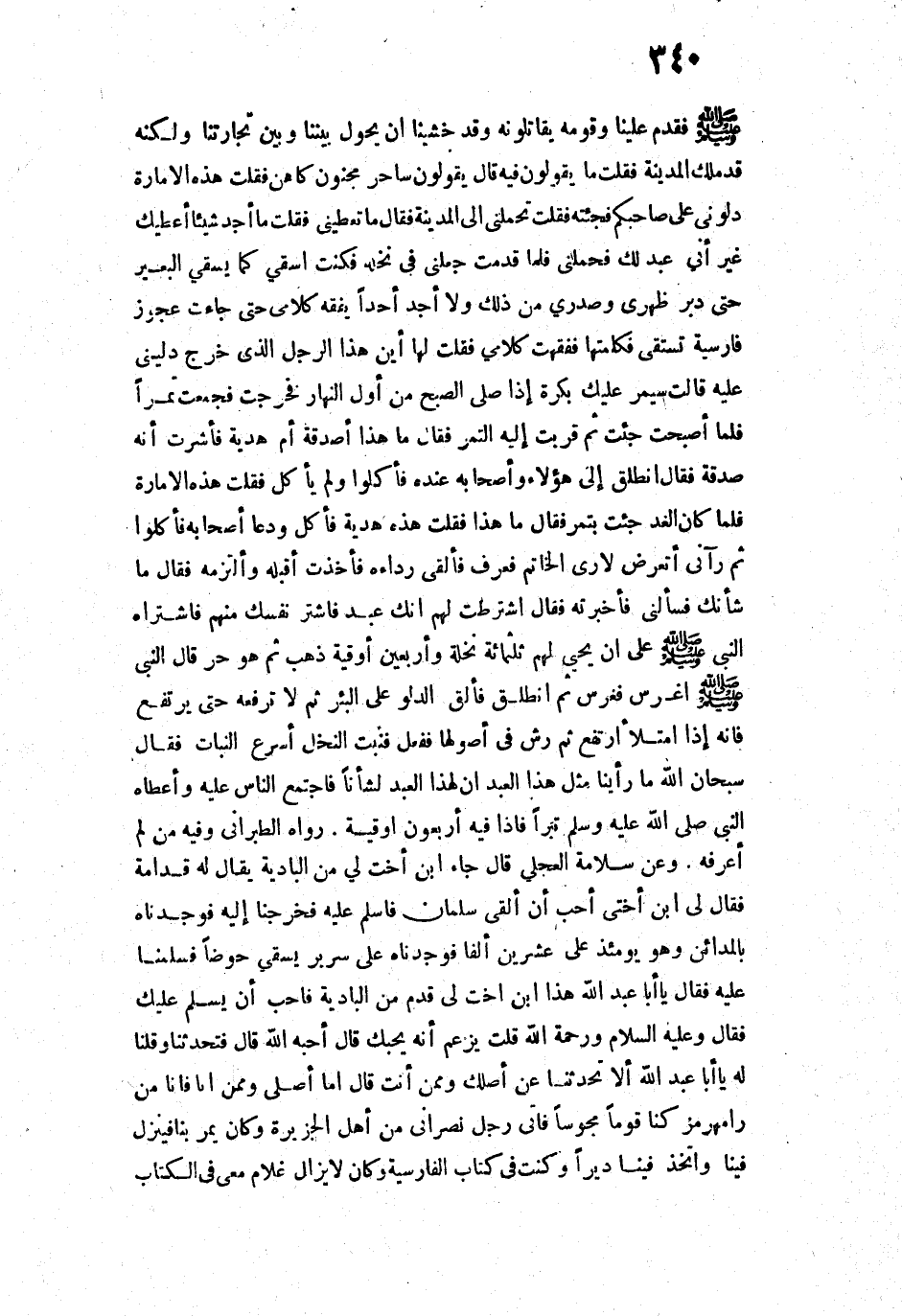 - صَلَّى اللَّهُ عَلَيْهِ وَسَلَّمَ - فَقَدِمَ عَلَيْنَا وَقَوْمُهُ يُقَاتِلُونَهُ، وَقَدْ خَشِينَا أَنْ يَحُولَ بَيْنَنَا وَبَيْنَ تِجَارَتِنَا، وَلَكِنَّهُ قَدْ مَلَكَ الْمَدِينَةَ. فَقُلْتُ: مَا يَقُولُونَ فِيهِ؟ قَالَ: يَقُولُونَ: سَاحِرٌ، مَجْنُونٌ، كَاهِنٌ، فَقُلْتُ: هَذِهِ الْأَمَارَةُ، دُلُّونِي عَلَى صَاحِبِكُمْ. فَجِئْتُهُ فَقُلْتُ: تَحْمِلُنِي إِلَى الْمَدِينَةِ؟ فَقَالَ: مَا تُعْطِينِي؟ فَقُلْتُ: مَا أَجِدُ شَيْئًا أُعْطِيكَ غَيْرَ أَنِّي لَكَ عَبْدٌ، فَحَمَلَنِي، فَلَمَّا قَدِمْتُ جَعَلَنِي فِي نَخْلِهِ، فَكُنْتُ أَسْقِي كَمَا يَسْقِي الْبَعِيرُ، حَتَّى دَبِرَ ظَهْرِي وَصَدْرِي مِنْ ذَلِكَ، وَلَا أَجِدُ أَحَدًا يَفْقَهُ كَلَامِي، حَتَّى جَاءَتْ عَجُوزٌ فَارِسِيَّةٌ تَسْتَقِي فَكَلَّمْتُهَا فَفَقُهَتْ كَلَامِي، فَقُلْتُ لَهَا: أَيْنَ هَذَا الرَّجُلُ الَّذِي خَرَجَ؟ دُلِّينِي عَلَيْهِ. قَالَتْ: سَيَمُرُّ عَلَيْكَ بُكْرَةً إِذَا صَلَّى الصُّبْحَ مِنْ أَوَّلِ النَّهَارِ، فَخَرَجْتُ فَجَمَعْتُ تَمْرًا، فَلَمَّا أَصْبَحْتُ جِئْتُ، ثُمَّ قَرَّبْتُ إِلَيْهِ التَّمْرَ، فَقَالَ: " مَا هَذَا أَصَدَقَةٌ أَمْ هَدِيَّةٌ؟ ". فَأَشَرْتُ أَنَّهُ صَدَقَةٌ، فَقَالَ: " انْطَلِقْ إِلَى هَؤُلَاءِ ". وَأَصْحَابُهُ عِنْدَهُ، فَأَكَلُوا وَلَمْ يَأْكُلْ، فَقُلْتُ: هَذِهِ الْأَمَارَةُ.