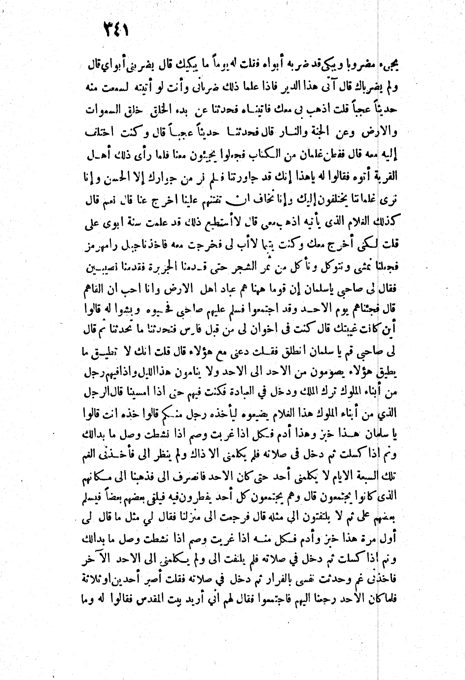 يَجِيءُ مَضْرُوبًا يَبْكِي وَقَدْ ضَرَبَهُ أَبَوَاهُ، فَقُلْتُ لَهُ يَوْمًا: مَا يُبْكِيكَ؟ قَالَ: يَضْرِبُنِي أَبَوَايَ، قَالَ: وَلِمَ يَضْرِبَاكَ؟ قَالَ: آتِي صَاحِبَ هَذَا الدَّيْرَ فَإِذَا عَلِمَا ذَلِكَ ضَرَبَانِي، وَأَنْتَ لَوْ أَتَيْتَهُ لَسَمِعْتَ مِنْهُ حَدِيثًا عَجَبًا، قُلْتُ: اذْهَبْ بِي مَعَكَ، فَأَتَيْنَاهُ فَحَدَّثَنَا عَنْ بَدْءِ الْخَلْقِ خَلْقِ وَعَنْ بَدْءِ خَلْقِ السَّمَاوَاتِ وَالْأَرْضِ، وَعَنِ الْجَنَّةِ وَالنَّارِ. قَالَ: فَحَدَّثَنَا حَدِيثًا عَجَبًا قَالَ: وَكُنْتُ أَخْتَلِفُ إِلَيْهِ مَعَهُ. قَالَ: فَفَطِنَ لَنَا غِلْمَانٌ مِنَ الْكُتَّابِ، فَجَعَلُوا يَجِيئُونَ مَعَنَا، فَلَمَّا رَأَى ذَلِكَ أَهْلُ الْقَرْيَةِ أَتَوْهُ، فَقَالُوا لَهُ: يَا هَذَا إِنَّكَ قَدْ جَاوَرْتَنَا فَلَمْ نَرَ مِنْ جِوَارِكَ إِلَّا الْحُسْنَ، وَإِنَّا نَرَى غِلْمَانَنَا يَخْتَلِفُونَ إِلَيْكَ، وَإِنَّا نَخَافُ أَنْ تَفْتِنَهُمْ عَلَيْنَا، اخْرُجْ عَنَّا، قَالَ: نَعَمْ. قَالَ لِذَلِكَ الْغُلَامِ الَّذِي يَأْتِيهِ: اذْهَبْ مَعِي قَالَ: لَا أَسْتَطِيعُ ذَلِكَ، قَدْ عَلِمْتُ شِدَّةَ أَبَوَيْ عَلَيَّ. قُلْتُ: لَكِنِّي أَخْرُجُ مَعَكَ. وَكُنْتُ يَتِيمًا لَا أَبَ لِي. فَخَرَجْتُ مَعَهُ فَأَخَذْنَا جَبَلَ رَامَهُرْمُزَ، فَجَعَلْنَا نَمْشِي وَنَتَوَكَّلُ، وَنَأْكُلُ مِنْ ثَمَرِ الشَّجَرِ حَتَّى قَدِمْنَا الْجَزِيرَةَ، فَقَدِمْنَا نَصِيبِينَ، فَقَالَ لِي صَاحِبِي: يَا سَلْمَانُ، إِنَّ قَوْمًا هَاهُنَا هُمْ عُبَّادُ أَهْلِ الْأَرْضِ، وَأَنَا أُحِبُّ أَنْ أَلْقَاهُمْ. قَالَ: فَجِئْنَاهُمْ إِلَيْهِمْ يَوْمَ الْأَحَدِ، وَقَدِ اجْتَمَعُوا، فَسَلَّمَ عَلَيْهِمْ صَاحِبِي فَحَيَّوْهُ وَبَشُّوا لَهُ، وَقَالُوا: أَيْنَ كَانَتْ غَيْبَتُكَ؟ قَالَ: كُنْتُ فِي إِخْوَانٍ لِي مِنْ قِبَلِ فَارِسٍ، فَتَحَدَّثْنَا مَا تَحَدَّثْنَا، ثُمَّ قَالَ لِي صَاحِبِي: قُمْ يَا سَلْمَانُ انْطَلِقْ، فَقُلْتُ: لَا دَعْنِي مَعَ هَؤُلَاءِ. قَالَ: قُلْتُ إِنَّكَ لَا تُطِيقُ مَا يُطِيقُ هَؤُلَاءِ، يَصُومُونَ مِنَ الْأَحَدِ إِلَى الْأَحَدِ، وَلَا يَنَامُونَ هَذَا اللَّيْلَ. وَإِذَا فِيهِمْ رَجُلٌ مِنْ أَبْنَاءِ الْمُلُوكِ تَرَكَ الْمُلْكَ وَدَخَلَ فِي الْعِبَادَةِ، فَكُنْتُ فِيهِمْ حَتَّى إِذَا أَمْسَيْنَا فَجَعَلُوا يَذْهَبُونَ وَاحِدًا وَاحِدًا إِلَى غَارِهِ الَّذِي يَكُونُ فِيهِ، قَالَ: فَلَمَّا أَمْسَيْنَا، قَالَ الرَّجُلُ الَّذِي مِنْ أَبْنَاءِ الْمُلُوكِ: مَا هَذَا الْغُلَامُ؟ يُضَيِّعُوهُ لِيَأْخُذْهُ رَجُلٌ مِنْكُمْ. قَالُوا: خُذْهُ أَنْتَ، قَالُ لِي: هَلُمَّ يَا سَلْمَانُ فَذَهَبَ بِي مَعَهُ حَتَّى أَتَى غَارَهُ الَّذِي يَكُونُ، فَقَالَ: يَا سَلْمَانُ هَذَا خُبْزٌ وَهَذَا أَدَمٌ، فَكُلْ إِذَا غَرَثْتَ، وَصُمْ إِذَا نَشِطَتْ، وَصَلِّ مَا بَدَا لَكَ، وَنَمْ إِذَا كَسِلْتَ، ثُمَّ قَامَ فِي صَلَاتِهِ فَلَمْ يُكَلِّمْنِي إِلَّا ذَاكَ وَلَمْ يَنْظُرْ إِلَيَّ، فَأَخَذَنِي الْغَمُّ تِلْكَ السَّبْعَةَ الْأَيَّامَ لَا يُكَلِّمُنِي أَحَدٌ حَتَّى كَانَ الْأَحَدُ، فَانْصَرَفَ إِلَيَّ، فَذَهَبْنَا إِلَى مَكَانِهِمُ الَّذِي كَانُوا يَجْتَمِعُونَ. قَالَ: وَهُمْ يَجْتَمِعُونَ كُلَّ أَحَدٍ، يُفْطِرُونَ فِيهِ، فَيَلْقَى بَعْضُهُمْ بَعْضًا فَيُسَلِّمُ بَعْضُهُمْ عَلَى بَعْضٍ ثُمَّ لَا يَلْتَفِتُونَ إِلَى مِثْلِهِ. قَالَ: فَرَجَعْنَا إِلَى مَنْزِلِنَا فَقَالَ لِي مِثْلَ مَا قَالَ لِي أَوَّلَ مَرَّةٍ: هَذَا خُبْزٌ وَأَدَمٌ، فَكُلْ مِنْهُ إِذَا غَرَثْتَ، وَصُمْ إِذَا نَشِطَتْ، وَصَلِّ مَا بَدَا لَكَ، وَنَمْ إِذَا كَسِلْتَ. ثُمَّ دَخَلَ فِي صَلَاتِهِ فَلَمْ يَلْتَفِتْ إِلَيَّ وَلَمْ يُكَلِّمْنِي إِلَى الْأَحَدِ الْآ