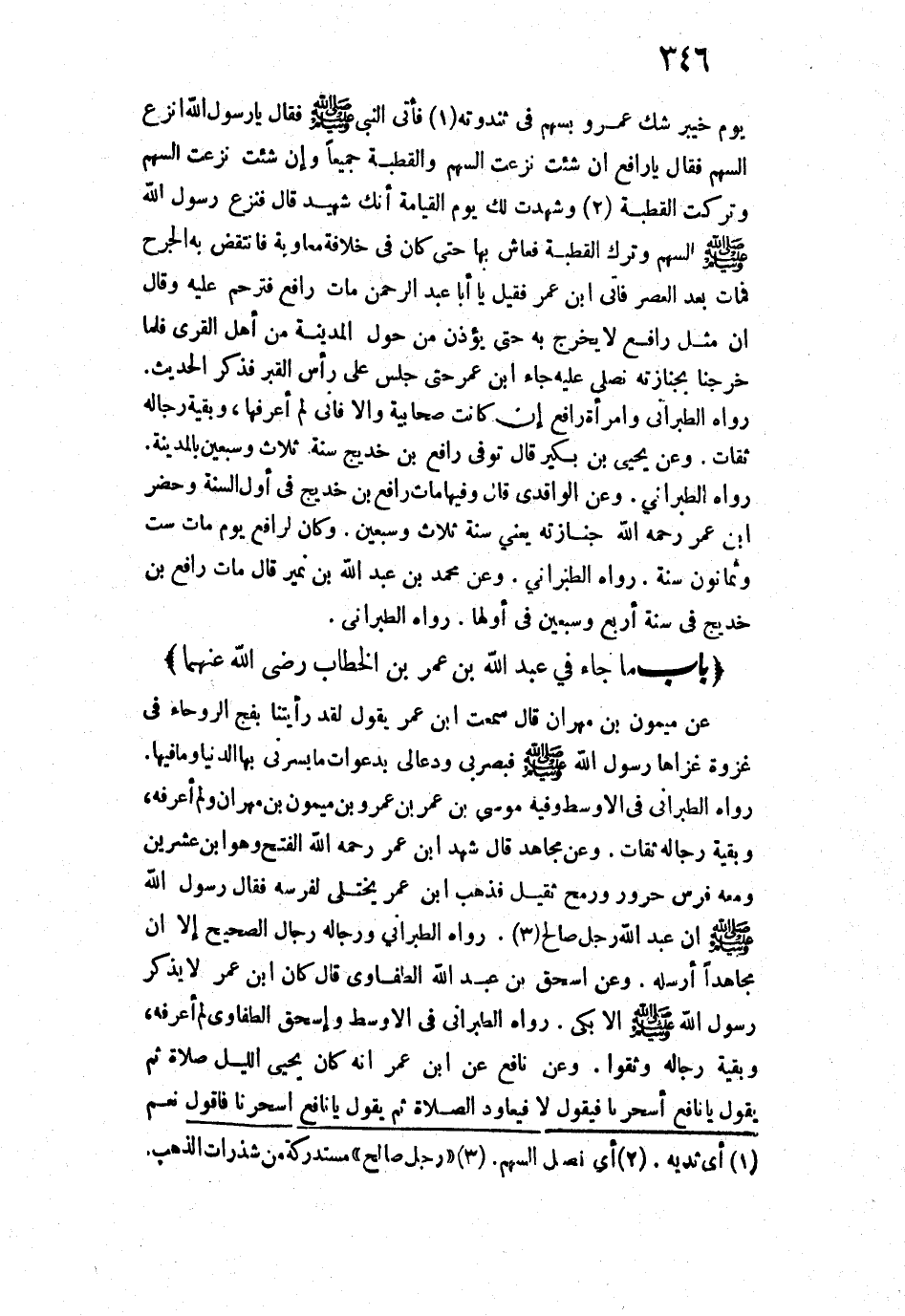 يَوْمَ خَيْبَرَ - شَكَّ عَمْرٌو - بِسَهْمٍ فِي ثَنْدُوَتِهِ، فَأَتَى النَّبِيَّ - صَلَّى اللَّهُ عَلَيْهِ وَسَلَّمَ - فَقَالَ: يَا رَسُولَ اللَّهِ، انْزِعِ السَّهْمَ، فَقَالَ: " يَا رَافِعُ، إِنْ شِئْتَ نَزَعْتُ السَّهْمَ وَالْقُطْبَةَ جَمِيعًا، وَإِنْ شِئْتَ نَزَعْتُ السَّهْمَ وَتَرَكْتُ الْقُطْبَةَ وَشَهِدَتُ لَكَ يَوْمَ الْقِيَامَةِ أَنَّكَ شَهِيدٌ ". قَالَ: فَنَزَعَ رَسُولُ اللَّهِ - صَلَّى اللَّهُ عَلَيْهِ وَسَلَّمَ - السَّهْمَ وَتَرَكَ الْقُطْبَةَ، فَعَاشَ بِهَا حَتَّى كَانَ فِي خِلَافَةِ مُعَاوِيَةَ، فَانْتَفَضَ بِهِ الْجُرْحُ فَمَاتَ بَعْدَ الْعَصْرِ، فَأُتِيَ ابْنُ عُمَرَ، فَقِيلَ لَهُ: يَا أَبَا عَبْدِ الرَّحْمَنِ، مَاتَ رَافِعٌ، فَتَرَحَّمَ عَلَيْهِ وَقَالَ: إِنَّ مِثْلَ رَافِعٍ لَا يُخْرَجُ بِهِ حَتَّى يُؤَذَّنَ مِنْ حَوْلِ الْمَدِينَةِ مِنْ أَهْلِ الْقُرَى، فَلَمَّا خَرَجْنَا بِجِنَازَتِهِ نُصَلِّي عَلَيْهِ جَاءَ ابْنُ عُمَرَ حَتَّى جَلَسَ عَلَى رَأْسِ الْقَبْرِ». فَذَكَرَ الْحَدِيثَ.