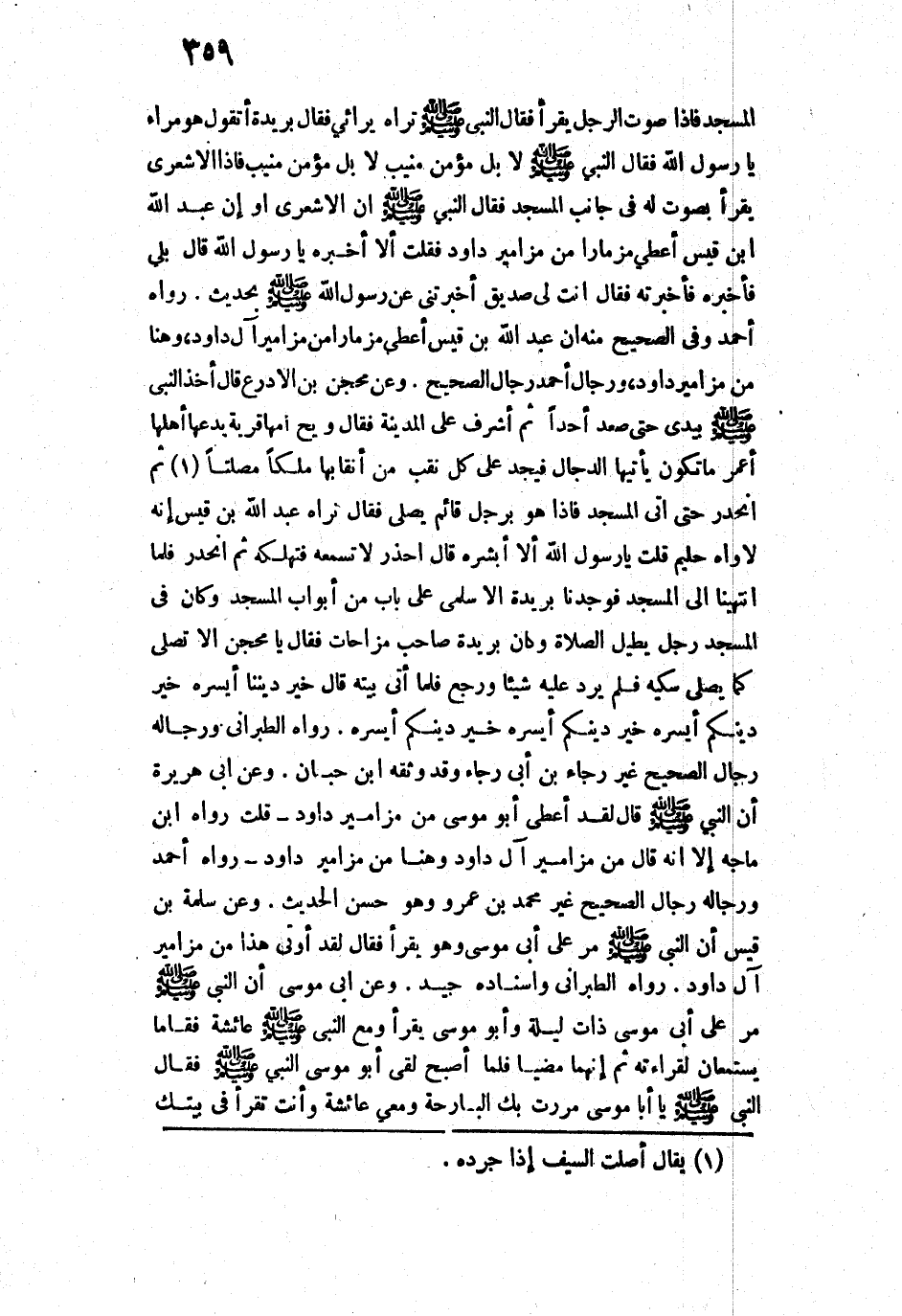رَوَاهُ أَحْمَدُ، وَفِي الصَّحِيحِ مِنْهُ: «أَنَّ عَبْدَ اللَّهِ بْنَ قَيْسٍ أُعْطِيَ مِزْمَارًا مِنْ مَزَامِيرِ آلِ دَاوُدَ» ". وَهُنَا: " مِنْ مَزَامِيرِ دَاوُدَ ". وَرِجَالُ أَحْمَدَ رِجَالُ الصَّحِيحِ.