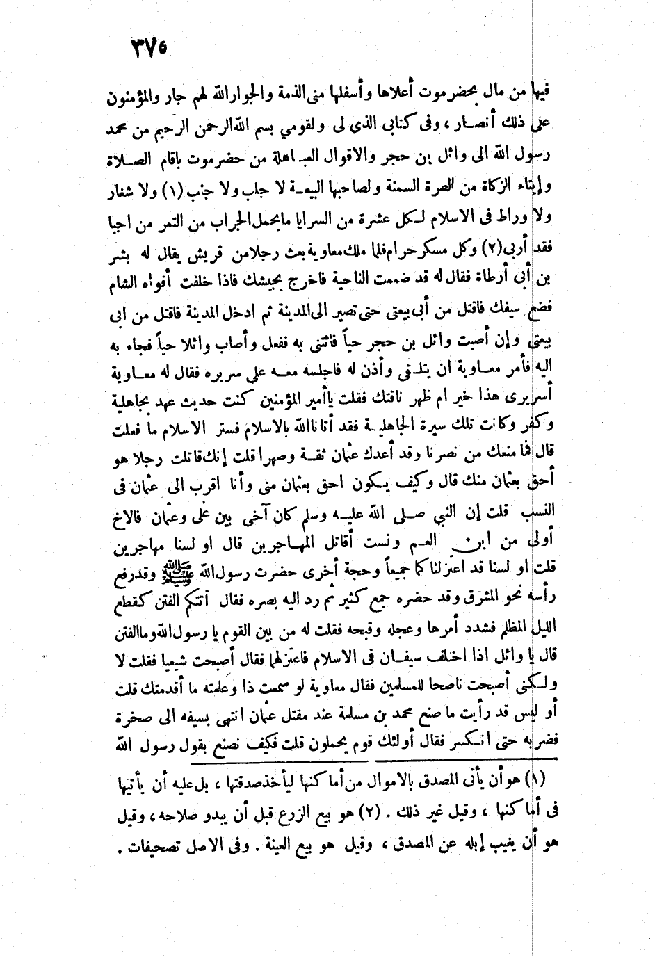 وَفِي الْكِتَابِ الَّذِي لِي وَلِقَوْمِي: " بِسْمِ اللَّهِ الرَّحْمَنِ الرَّحِيمِ، مِنْ مُحَمَّدٍ رَسُولِ اللَّهِ إِلَى وَائِلِ بْنِ حُجْرٍ وَالْأَقْوَالِ الْعَيَاهِلَةِ مِنْ حَضْرَمَوْتَ، بِإِقَامِ الصَّلَاةِ، وَإِيتَاءِ الزَّكَاةِ مِنَ الصِّرْمَةِ التِّيعَةِ وَلِصَاحِبِهَا الْثِّيمَةُ، لَا جَلَبَ وَلَا جَنَبَ، وَلَا شِغَارَ وَلَا وِرَاطَ فِي الْإِسْلَامِ. لِكُلِّ عَشْرَةٍ مِنَ السَّرَايَا مَا يَحْمِلُ الْقِرَابُ مِنَ التَّمْرِ، مَنْ أَحْيَا فَقَدْ أَرْبَى، وَكُلُّ مُسْكِرٍ حَرَامٌ ".