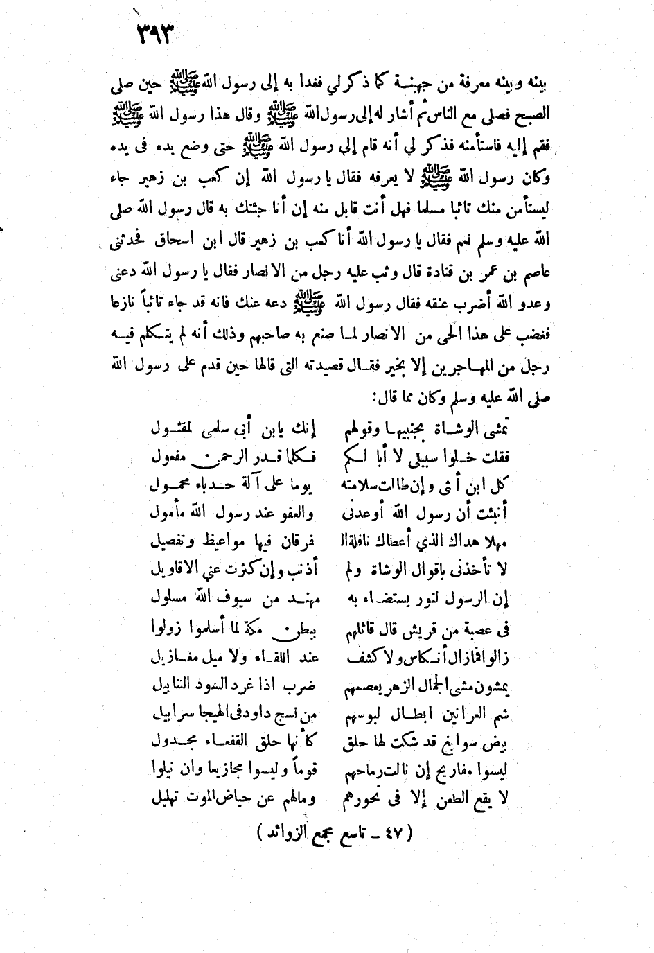 بَيْنَهُ وَبَيْنَهُ مَعْرِفَةٌ مِنْ جُهَيْنَةَ - كَمَا ذُكِرَ لِي - فَغَدَا بِهِ إِلَى رَسُولِ اللَّهِ - صَلَّى اللَّهُ عَلَيْهِ وَسَلَّمَ - حِينَ صَلَّى الصُّبْحَ، فَصَلَّى مَعَ النَّاسِ، ثُمَّ أَشَارَ لَهُ إِلَى رَسُولِ اللَّهِ - صَلَّى اللَّهُ عَلَيْهِ وَسَلَّمَ - وَقَالَ: هَذَا رَسُولُ اللَّهِ - صَلَّى اللَّهُ عَلَيْهِ وَسَلَّمَ - فَقُمْ إِلَيْهِ فَاسْتَأْمِنْهُ، فَذُكِرَ لِي أَنَّهُ قَامَ إِلَى رَسُولِ اللَّهِ - صَلَّى اللَّهُ عَلَيْهِ وَسَلَّمَ - حَتَّى وَضَعَ يَدَهُ فِي يَدِهِ، وَكَانَ رَسُولُ اللَّهِ - صَلَّى اللَّهُ عَلَيْهِ وَسَلَّمَ - لَا يَعْرِفُهُ، فَقَالَ: يَا رَسُولَ اللَّهِ، إِنْ كَعَّبَ بْنَ زُهَيْرٍ جَاءَ لِيَسْتَأْمِنَ مِنْكَ تَائِبًا مُسْلِمًا؛ فَهَلْ أَنْتَ قَابِلٌ مِنْهُ إِنْ أَنَا جِئْتُكَ بِهِ؟ قَالَ رَسُولُ اللَّهِ - صَلَّى اللَّهُ عَلَيْهِ وَسَلَّمَ -: " نَعَمْ ". فَقَالَ: يَا رَسُولَ اللَّهِ، أَنَا كَعْبُ بْنُ زُهَيْرٍ.