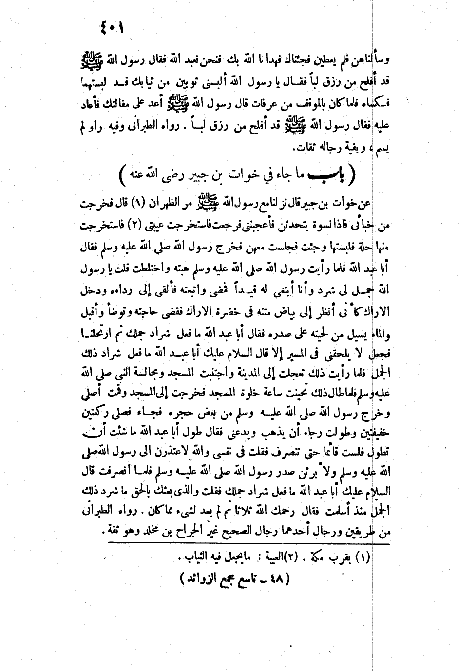 16105 - عَنْ خَوَّاتِ بْنِ جُبَيْرٍ قَالَ: «نَزَلْنَا مَعَ رَسُولِ اللَّهِ - صَلَّى اللَّهُ عَلَيْهِ وَسَلَّمَ - مَرَّ الظَّهْرَانِ قَالَ: فَخَرَجْتُ مِنْ خِبَائِي، فَإِذَا نِسْوَةٌ يَتَحَدَّثْنَ، فَأَعْجَبَنِي، فَرَجَعْتُ فَاسْتَخْرَجْتُ عَيْبَتِي، فَاسْتَخْرَجْتُ مِنْهَا حُلَّةً فَلَبِسْتُهَا، وَجِئْتُ فَجَلَسْتُ مَعَهُنَّ، فَخَرَجَ رَسُولُ اللَّهِ - صَلَّى اللَّهُ عَلَيْهِ وَسَلَّمَ - فَقَالَ: " أَبَا عَبْدِ اللَّهِ ". فَلَمَّا رَأَيْتُ رَسُولَ اللَّهِ - صَلَّى اللَّهُ عَلَيْهِ وَسَلَّمَ - هِبْتُهُ وَاخْتَلَطْتُ، قُلْتُ: يَا رَسُولَ اللَّهِ، جَمَلٌ لِي شَرَدَ وَأَنَا أَبْتَغِي لَهُ قَيْدًا، فَمَضَى وَاتَّبَعْتُهُ، فَأَلْقَى إِلَيَّ رِدَاءَهُ وَدَخَلَ الْأَرَاكَ، كَأَنِّي أَنْظُرُ إِلَى بَيَاضِ مَتْنِهِ فِي خُضْرَةِ الْأَرَاكِ، فَقَضَى حَاجَتَهُ وَتَوَضَّأَ، وَأَقْبَلَ وَالْمَاءُ يَسِيلُ مِنْ لِحْيَتِهِ عَلَى صَدْرِهِ، فَقَالَ: " أَبَا عَبْدِ اللَّهِ، مَا فَعَلَ شِرَادُ جَمَلِكَ؟ ". ثُمَّ ارْتَحَلْنَا، فَجَعَلَ لَا يَلْحَقُنِي فِي الْمَسِيرِ إِلَّا قَالَ: " السَّلَامُ عَلَيْكَ أَبَا عَبْدِ اللَّهِ، مَا فَعَلَ شِرَادُ ذَلِكَ الْجَمَلِ؟ ". فَلَمَّا رَأَيْتُ ذَلِكَ تَعَجَّلْتُ إِلَى الْمَدِينَةِ، وَاجْتَنَبْتُ الْمَسْجِدَ وَمُجَالَسَةَ النَّبِيِّ - صَلَّى اللَّهُ عَلَيْهِ وَسَلَّمَ - فَلَمَّا طَالَ ذَلِكَ تَحَيَّنْتُ سَاعَةَ خَلْوَةِ الْمَسْجِدِ، فَخَرَجْتُ إِلَى الْمَسْجِدِ، وَقُمْتُ أَصَلِّي، وَخَرَجَ رَسُولُ اللَّهِ - صَلَّى اللَّهُ عَلَيْهِ وَسَلَّمَ - مِنْ بَعْضِ حُجَرِهِ، فَجَاءَ فَصَلَّى رَكْعَتَيْنِ خَفِيفَتَيْنِ، وَطَوَّلْتُ رَجَاءَ أَنْ يَذْهَبَ وَيَدَعَنِي، فَقَالَ: " طَوِّلْ أَبَا عَبْدِ اللَّهِ مَا شِئْتَ أَنْ تُطَوِّلَ فَلَسْتُ قَائِمًا حَتَّى تَنْصَرِفَ ". فَقُلْتُ فِي نَفْسِي: وَاللَّهِ لَأَعْتَذِرَنَّ إِلَى رَسُولِ اللَّهِ - صَلَّى اللَّهُ عَلَيْهِ وَسَلَّمَ - وَلَأُبَرِّئَنَّ صَدْرَ رَسُولِ اللَّهِ - صَلَّى اللَّهُ عَلَيْهِ وَسَلَّمَ - فَلَمَّا انْصَرَفْتُ قَالَ: " السَّلَامُ عَلَيْكَ أَبَا عَبْدِ اللَّهِ مَا فَعَلَ شِرَادُ جَمَلِكَ؟ ". فَقُلْتُ: وَالَّذِي بَعَثَكَ بِالْحَقِّ مَا شَرَدَ ذَلِكَ الْجَمَلُ مُنْذُ أَسْلَمْتُ، فَقَالَ: " رَحِمَكَ اللَّهُ " - ثَلَاثًا - ثُمَّ لَمْ يَعُدْ لِشَيْءٍ مِمَّا كَانَ».