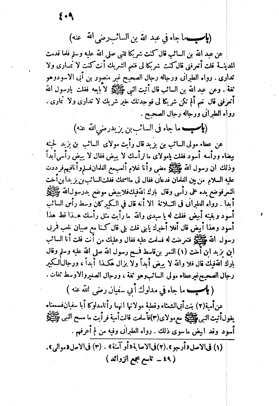 رَوَاهُ الطَّبَرَانِيُّ فِي الثَّلَاثَةِ، إِلَّا أَنَّهُ قَالَ فِي الْكَبِيرِ: «كَانَ وَسَطُ رَأْسِ السَّائِبِ أَسْوَدَ وَبَقِيَّتُهُ أَبْيَضَ، فَقُلْتُ لَهُ: يَا سَيِّدِي، وَاللَّهِ مَا رَأَيْتُ مِثْلَ رَأْسِكَ هَذَا قَطُّ! هَذَا أَسْوَدُ، وَهَذَا أَبْيَضُ! قَالَ: أَفَلَا أُخْبِرُكَ يَا بُنَيَّ؟ قُلْتُ: بَلَى قَالَ: إِنِّي كُنْتُ مَعَ صِبْيَانٍ نَلْعَبُ، فَمَرَّ بِي رَسُولُ اللَّهِ - صَلَّى اللَّهُ عَلَيْهِ وَسَلَّمَ - فَتَعَرَّضْتُ لَهُ فَسَلَّمْتُ عَلَيْهِ، فَقَالَ: " وَعَلَيْكَ، مَنْ أَنْتَ؟ ". قُلْتُ: أَنَا السَّائِبُ بْنُ يَزِيدَ أَخُو النَّمِرِ بْنِ قَاسِطٍ، فَمَسَحَ رَسُولُ اللَّهِ - صَلَّى اللَّهُ عَلَيْهِ وَسَلَّمَ - وَقَالَ: " بَارَكَ اللَّهُ فِيكَ ". قَالَ: فَلَا وَاللَّهِ لَا يَبْيَضُّ أَبَدًا، وَلَا يَزَالُ هَكَذَا أَبَدًا».