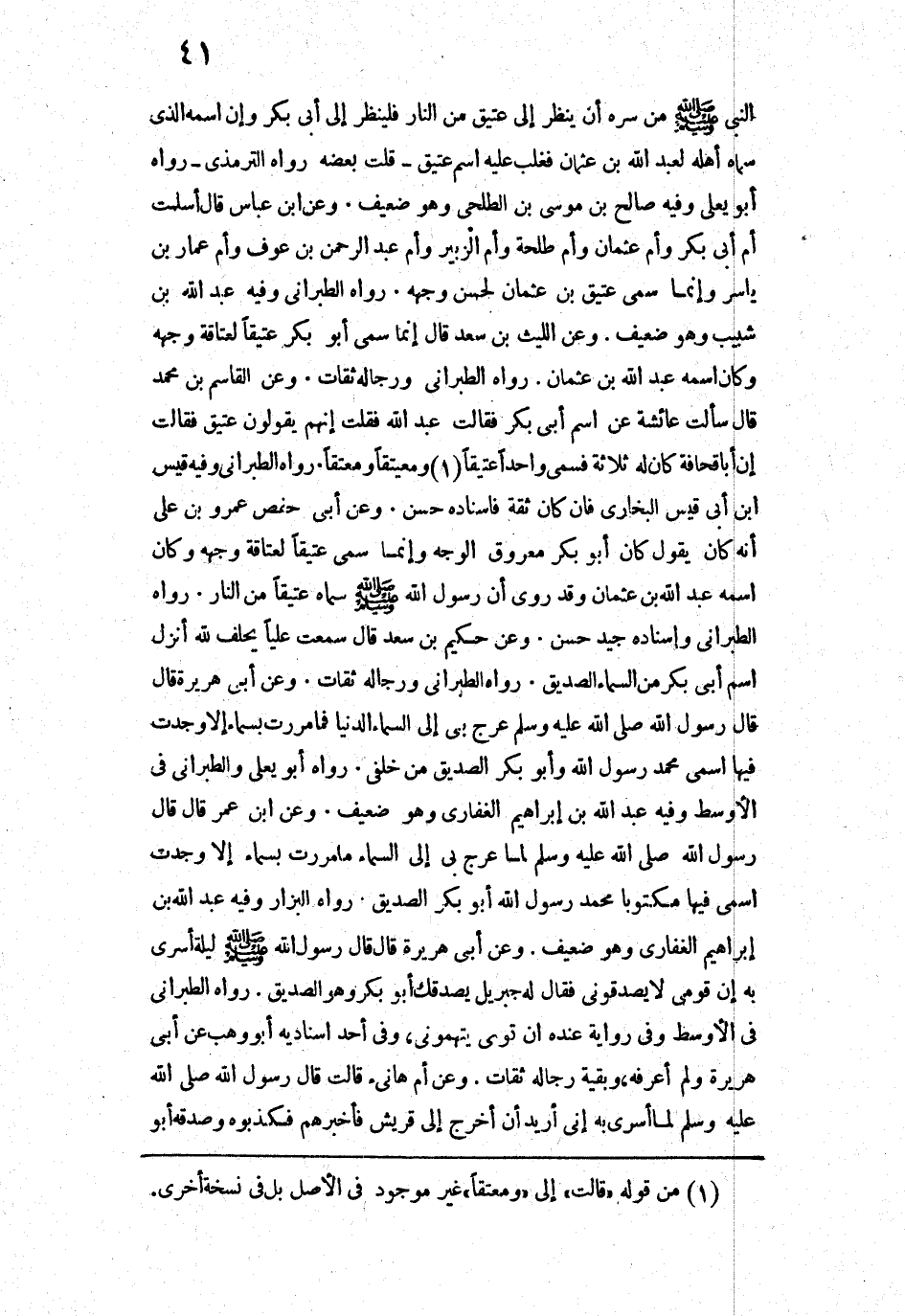 النَّبِيُّ - صَلَّى اللَّهُ عَلَيْهِ وَسَلَّمَ -: " مَنْ سَرَّهُ أَنْ يَنْظُرَ إِلَى عَتِيقٍ مِنَ النَّارِ فَلْيَنْظُرْ إِلَى أَبِي بَكْرٍ، وَإِنَّ اسْمَهُ الَّذِي سَمَّاهُ أَهْلُهُ: لَعَبْدُ اللَّهِ بْنُ عُثْمَانَ، فَغَلَبَ عَلَيْهِ اسْمُ عَتِيقٍ» ".