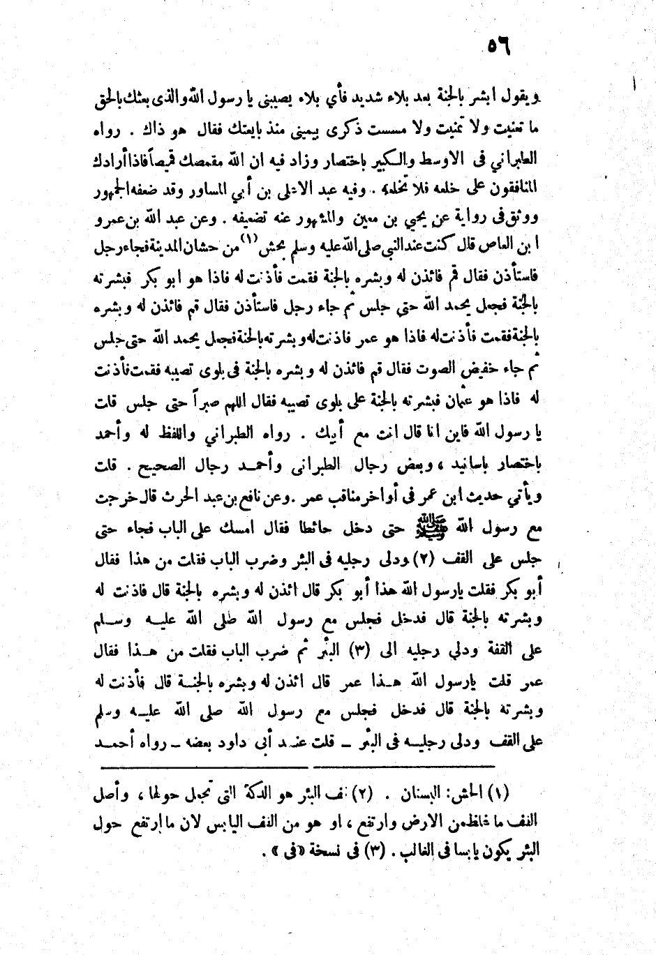 14376 - وَعَنْ نَافِعِ بْنِ عَبْدِ الْحَارِثِ قَالَ: «خَرَجْتُ مَعَ رَسُولِ اللَّهِ - صَلَّى اللَّهُ عَلَيْهِ وَسَلَّمَ - حَتَّى دَخَلَ حَائِطًا، فَقَالَ: " أَمْسِكْ عَلَيَّ الْبَابَ ". فَجَاءَ حَتَّى جَلَسَ عَلَى الْقُفِّ، وَدَلَّى رِجْلَيْهِ فِي الْبِئْرِ، وَضُرِبَ الْبَابُ، فَقُلْتُ: مَنْ هَذَا؟ فَقَالَ: أَبُو بَكْرٍ. فَقُلْتُ: يَا رَسُولَ اللَّهِ، هَذَا أَبُو بَكْرٍ قَالَ: " ائْذَنْ لَهُ، وَبَشِّرْهُ بِالْجَنَّةِ ". قَالَ: فَأَذِنْتُ لَهُ وَبَشَّرْتُهُ بِالْجَنَّةِ. قَالَ: فَدَخَلَ فَجَلَسَ مَعَ رَسُولِ اللَّهِ - صَلَّى اللَّهُ عَلَيْهِ وَسَلَّمَ - عَلَى الْقُفَّةِ، وَدَلَّى رِجْلَيْهِ فِي الْبِئْرِ. ثُمَّ ضُرِبَ الْبَابُ، فَقُلْتُ: مَنْ هَذَا؟ فَقَالَ: عُمَرُ. قُلْتُ: يَا رَسُولَ اللَّهِ، هَذَا عُمَرُ. قَالَ: " ائْذَنْ لَهُ، وَبَشِّرْهُ بِالْجَنَّةِ ". قَالَ: فَأَذِنْتُ لَهُ وَبَشَّرْتُهُ بِالْجَنَّةِ. قَالَ: فَدَخَلَ فَجَلَسَ مَعَ رَسُولِ اللَّهِ - صَلَّى اللَّهُ عَلَيْهِ وَسَلَّمَ - عَلَى الْقُفِّ، وَدَلَّى رِجْلَيْهِ فِي الْبِئْرِ» [قَالَ: ثُمَّ ضَرَبَ الْبَابَ، فَقُلْتُ: مَنْ هَذَا قَالَ: عُثْمَانُ، فَقُلْتُ: يَا رَسُولَ اللَّهِ، هَذَا عُثْمَانُ، قَالَ: " ائْذَنْ لَهُ وَبَشِّرْهُ بِالْجَنَّةِ مَعَهَا بَلَاءٌ " فَأَذِنْتُ لَهُ وَبَشَّرْتُهُ بِالْجَنَّةِ، فَجَلَسَ مَعَ رَسُولِ اللَّهِ صَلَّى اللَّهُ عَلَيْهِ وَسَلَّمَ عَلَى الْقُفِّ وَدَلَّى رِجْلَيْهِ فِي الْبِئْرِ].