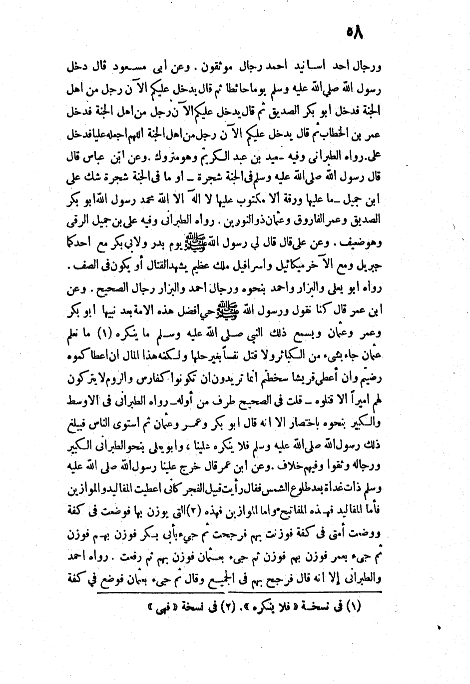 رَوَاهُ الطَّبَرَانِيُّ فِي الْأَوْسَطِ وَالْكَبِيرِ بِنَحْوِهِ بِاخْتِصَارٍ، إِلَّا أَنَّهُ «قَالَ: أَبُو بَكْرٍ، وَعُمَرُ، وَعُثْمَانُ، ثُمَّ اسْتَوَى النَّاسُ فَيَبْلُغُ ذَلِكَ رَسُولَ اللَّهِ - صَلَّى اللَّهُ عَلَيْهِ وَسَلَّمَ - فَلَا يُنْكِرُهُ عَلَيْنَا». وَأَبُو يَعْلَى بِنَحْوِ الطَّبَرَانِيِّ الْكَبِيرِ، وَرِجَالُهُ وُثِّقُوا، وَفِيهِمْ خِلَافٌ.