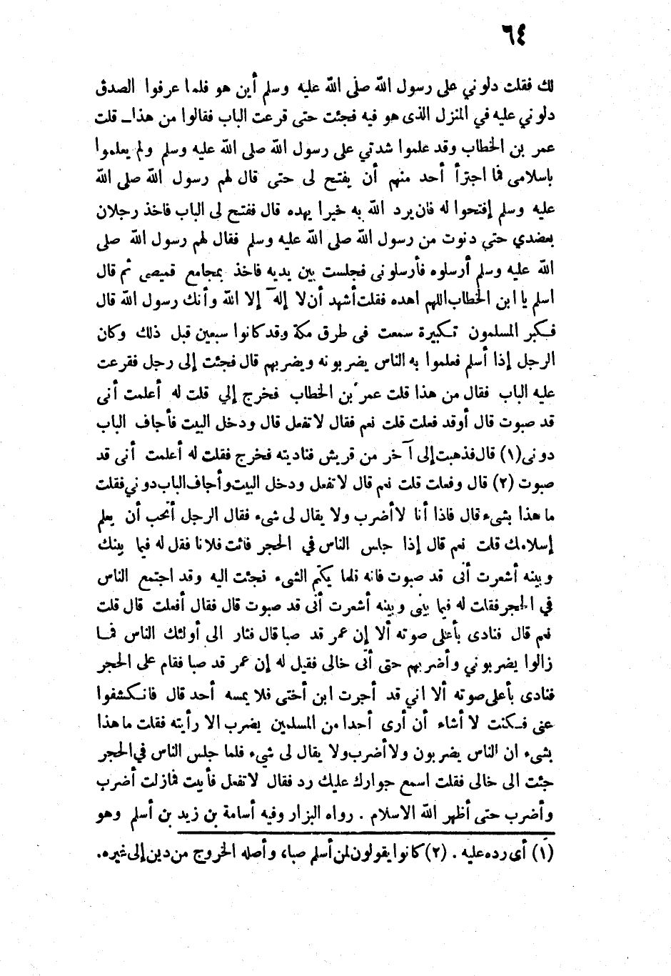 قَالَ: فَجِئْتُ إِلَى رَجُلٍ فَقَرَعْتُ عَلَيْهِ الْبَابَ، فَقَالَ: مَنْ هَذَا؟ قُلْتُ: عُمَرُ بْنُ الْخَطَّابِ. فَخَرَجَ إِلَيَّ، قُلْتُ لَهُ: أَعَلِمْتَ أَنِّي قَدْ صَبَوْتُ؟ قَالَ: أَوَقَدْ فَعَلْتَ؟ قُلْتُ: نَعَمْ. فَقَالَ: لَا تَفْعَلْ. قَالَ: وَدَخَلَ الْبَيْتَ فَأَجَافَ الْبَابَ دُونِي. قَالَ: فَذَهَبْتُ إِلَى آخَرَ مِنْ قُرَيْشٍ، فَنَادَيْتُهُ فَخَرَجَ، فَقُلْتُ لَهُ: أَعَلِمْتَ أَنِّي قَدْ صَبَوْتُ؟ قَالَ: وَفَعَلْتَ؟ قُلْتُ: نَعَمْ. قَالَ: لَا تَفْعَلْ، وَدَخَلَ الْبَيْتَ، وَأَجَافَ الْبَابَ دُونِي. فَقُلْتُ: مَا هَذَا بِشَيْءٍ. قَالَ: فَإِذَا أَنَا لَا أُضْرَبُ وَلَا يُقَالُ لِي شَيْءٌ. فَقَالَ الرَّجُلُ: أَتُحِبُّ أَنْ يُعْلَمَ إِسْلَامُكَ؟ قُلْتُ: نَعَمْ قَالَ: إِذَا جَلَسَ النَّاسُ فِي الْحِجْرِ فَائْتِ فُلَانًا فَقُلْ لَهُ فِيمَا بَيْنَكَ وَبَيْنَهُ: أَشْعَرْتَ أَنِّي قَدْ صَبَوْتُ؟ فَإِنَّهُ قَلَّمَا يَكْتُمُ الشَّيْءَ، فَجِئْتُ إِلَيْهِ وَقَدِ اجْتَمَعَ النَّاسُ فِي الْحِجْرِ، فَقُلْتُ لَهُ فِيمَا بَيْنِي وَبَيْنَهُ: أَشْعَرْتَ أَنِّي قَدْ صَبَوْتُ؟ قَالَ: فَقَالَ: أَفَعَلْتَ؟ قَالَ: قُلْتُ: نَعَمْ قَالَ: فَنَادَى بِأَعْلَى صَوْتِهِ: أَلَا إِنَّ عُمَرَ قَدْ صَبَا. قَالَ: فَثَارَ إِلَيَّ أُولَئِكَ النَّاسُ، فَمَا زَالُوا يَضْرِبُونِي وَأَضْرِبُهُمْ حَتَّى أَتَى خَالِي، فَقِيلَ لَهُ: إَنَّ عُمَرَ قَدْ صَبَا، فَقَامَ عَلَى الْحَجَرِ فَنَادَى بِأَعْلَى صَوْتِهِ: أَلَا إِنِّي قَدْ أَجَرْتُ ابْنَ أُخْتِي فَلَا يَمَسُّهُ أَحَدٌ. قَالَ: فَانْكَشَفُوا عَنِّي، فَكُنْتُ لَا أَشَاءُ أَنْ أَرَى أَحَدًا مِنَ الْمُسْلِمِينَ يُضْرَبُ إِلَّا رَأَيْتُهُ، فَقُلْتُ: مَا هَذَا بِشَيْءٍ إِنَّ النَّاسَ يُضْرَبُونَ وَلَا أُضْرَبُ، وَلَا يُقَالُ لِي شَيْءٌ. فَلَمَّا جَلَسَ النَّاسُ فِي الْحِجْرِ جِئْتُ إِلَى خَالِي، فَقُلْتُ: اسْمَعْ، جِوَارُكَ عَلَيْكَ رَدٌّ، فَقَالَ: لَا تَفْعَلْ، فَأَبَيْتُ، فَمَا زِلْتُ أَضْرِبُ وَأُضْرَبُ حَتَّى أَظْهَرَ اللَّهُ الْإِسْلَامَ ..