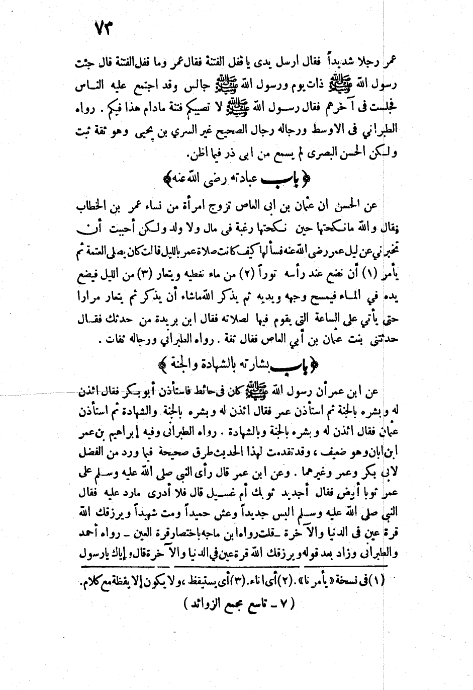 14454 - عَنِ ابْنِ عُمَرَ أَنَّ رَسُولَ اللَّهِ - صَلَّى اللَّهُ عَلَيْهِ وَسَلَّمَ - «كَانَ فِي حَائِطٍ، فَاسْتَأْذَنَ أَبُو بَكْرٍ فَقَالَ: " ائْذَنْ لَهُ، وَبَشِّرْهُ بِالْجَنَّةِ ". ثُمَّ اسْتَأْذَنَ عُمَرُ فَقَالَ: " ائْذَنْ لَهُ، وَبَشِّرْهُ بِالْجَنَّةِ وَالشَّهَادَةِ ". ثُمَّ اسْتَأْذَنَ عُثْمَانُ فَقَالَ: " ائْذَنْ لَهُ وَبَشِّرْهُ بِالْجَنَّةِ وَبِالشَّهَادَةِ» ".