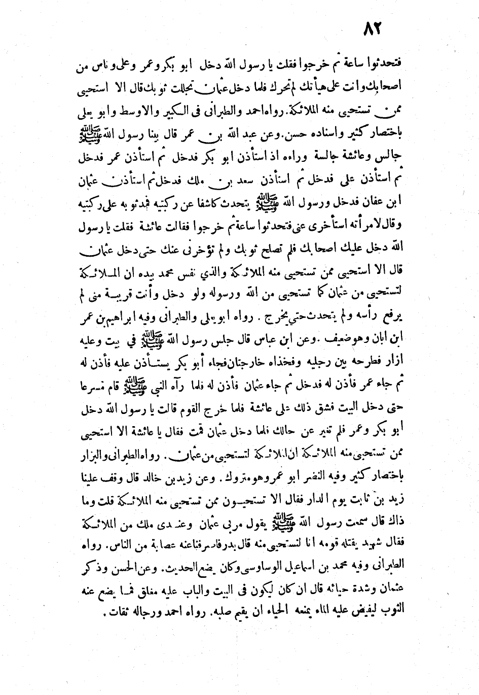 فَتَحَدَّثُوا سَاعَةً، ثُمَّ خَرَجُوا فَقُلْتُ: يَا رَسُولَ اللَّهِ، دَخَلَ أَبُو بَكْرٍ، وَعُمَرُ وَعَلِيٌّ، وَنَاسٌ مِنْ أَصْحَابِكَ، وَأَنْتَ عَلَى هَيْئَتِكَ لَمْ تُحَرِّكْ، فَلَمَّا دَخَلَ عُثْمَانُ تَجَلَّلْتَ ثَوْبَكَ؟ قَالَ: " أَلَا أَسْتَحْيِي مِمَّنْ تَسْتَحْيِي مِنْهُ الْمَلَائِكَةُ»! ".