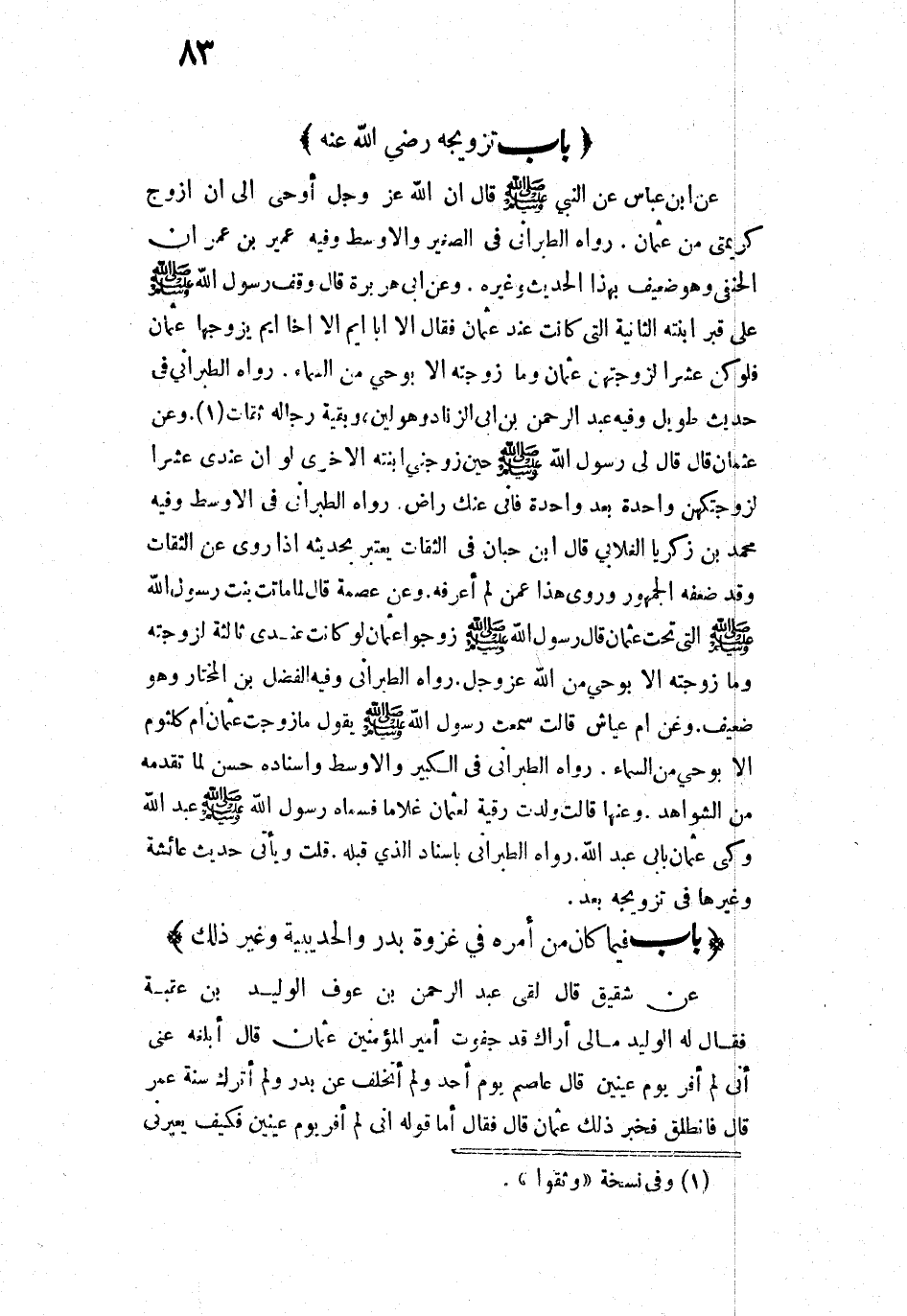 14510 - عَنْ عُثْمَانَ قَالَ: «قَالَ لِي رَسُولُ اللَّهِ - صَلَّى اللَّهُ عَلَيْهِ وَسَلَّمَ - حِينَ زَوَّجَنِي ابْنَتَهُ الْأُخْرَى: " لَوْ أَنَّ عِنْدِي عَشْرًا لَزَوَّجْتُكَهُنَّ وَاحِدَةً بَعْدَ وَاحِدَةٍ ; فَإِنِّي عَنْكَ رَاضٍ» ".