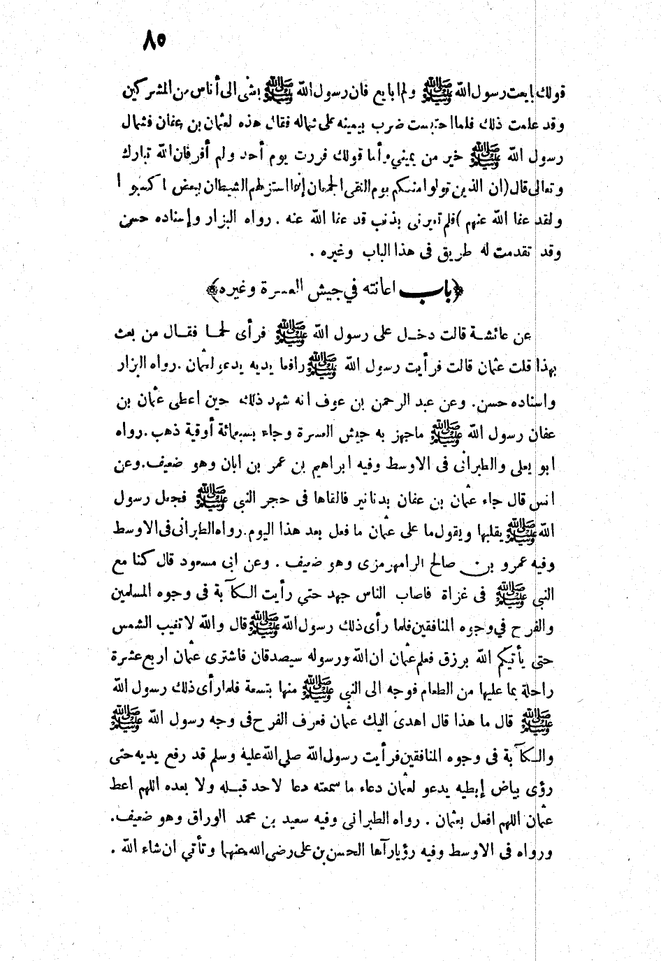 14523 - وَعَنْ أَبِي مَسْعُودٍ قَالَ: «كُنَّا مَعَ النَّبِيِّ - صَلَّى اللَّهُ عَلَيْهِ وَسَلَّمَ - فِي غَزَاةٍ، فَأَصَابَ النَّاسَ جَهْدٌ حَتَّى رَأَيْتُ الْكَآبَةَ فِي وُجُوهِ الْمُسْلِمِينَ، وَالْفَرَحَ فِي وُجُوهِ الْمُنَافِقِينَ، فَلَمَّا رَأَى ذَلِكَ رَسُولُ اللَّهِ - صَلَّى اللَّهُ عَلَيْهِ وَسَلَّمَ - قَالَ: " وَاللَّهِ لَا تَغِيبُ الشَّمْسُ حَتَّى يَأْتِيَكُمُ اللَّهُ بِرِزْقٍ ". فَعَلِمَ عُثْمَانُ أَنَّ اللَّهَ وَرَسُولَهُ سَيَصْدُقَانِ، فَاشْتَرَى عُثْمَانُ أَرْبَعَ عَشْرَةَ رَاحِلَةً بِمَا عَلَيْهَا مِنَ الطَّعَامِ، فَوَجَّهَ إِلَى النَّبِيِّ مِنْهَا بِتِسْعَةٍ، فَلَمَّا رَأَى ذَلِكَ النَّبِيُّ - صَلَّى اللَّهُ عَلَيْهِ وَسَلَّمَ - قَالَ: " مَا هَذَا؟ ". قَالَ: أَهْدَى إِلَيْكَ عُثْمَانُ، فَعُرِفَ الْفَرَحُ فِي وَجْهِ رَسُولِ اللَّهِ - صَلَّى اللَّهُ عَلَيْهِ وَسَلَّمَ - وَالْكَآبَةُ فِي وُجُوهِ الْمُنَافِقِينَ، فَرَأَيْتُ رَسُولَ اللَّهِ - صَلَّى اللَّهُ عَلَيْهِ وَسَلَّمَ - قَدْ رَفَعَ يَدَيْهِ حَتَّى رُئِيَ بَيَاضُ إِبْطَيْهِ يَدْعُو لِعُثْمَانَ دُعَاءً مَا سَمِعْتُهُ دَعَا لِأَحَدٍ قَبْلَهُ وَلَا بَعْدَهُ: اللَّهُمَّ أَعْطِ عُثْمَانَ اللَّهُمَّ افْعَلْ بِعُثْمَانَ» ".