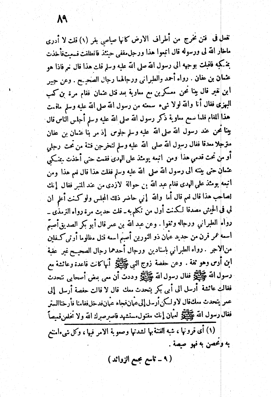 نَفْعَلُ فِي فِتَنٍ تَخْرُجُ مِنْ أَطْرَافِ الْأَرْضِ كَأَنَّهَا صَيَاصِيِّ بَقَرٍ؟ ". قُلْتُ: لَا أَدْرِي، مَا خَارَ اللَّهُ لِي وَرَسُولُهُ، [قَالَ: وَكَيْفَ تَفْعَلُ فِي أُخْرَى تَخْرُجُ بَعْدَهَا كَأَنَّ الْأُولَى فِيهَا انْتِفَاخَةُ أَرْنَبٍ؟ قُلْتُ: لَا أَدْرِي، مَا خَارَ اللُّهُ لِي وَرَسُولُهُ]. قَالَ: " اتَّبِعُوا هَذَا ". وَرَجُلٌ مُقَفٍّ حِينَئِذٍ، فَانْطَلَقْتُ فَسَعَيْتُ فَأَخَذْتُ بِمَنْكِبِهِ، فَأَقْبَلْتُ بِوَجْهِهِ إِلَى رَسُولِ اللَّهِ - صَلَّى اللَّهُ عَلَيْهِ وَسَلَّمَ - قُلْتُ: هَذَا؟ قَالَ: " نَعَمْ ". فَإِذَا هُوَ عُثْمَانُ بْنُ عَفَّانَ» رَضِيَ اللَّهُ عَنْهُ.