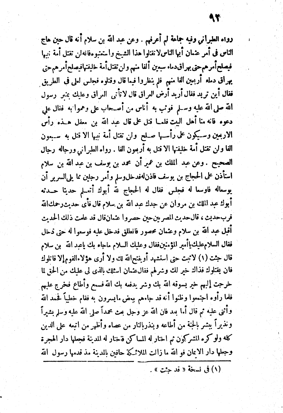 أَقْبَلَ عَبْدُ اللَّهِ بْنُ سَلَامٍ وَعُثْمَانُ مَحْصُورٌ، فَانْطَلَقَ فَدَخَلَ عَلَيْهِ، فَوَسَّعُوا لَهُ حَتَّى دَخَلَ، فَقَالَ: السَّلَامُ عَلَيْكَ يَا أَمِيرَ الْمُؤْمِنِينَ، فَقَالَ: وَعَلَيْكَ السَّلَامُ، مَا جَاءَ بِكَ يَا عَبْدَ اللَّهِ بْنَ سَلَامٍ؟ قَالَ: قَدْ جِئْتُ لِأَثْبُتَ حَتَّى أَسْتَشْهِدَ أَوْ يَفْتَحَ اللَّهُ لَكَ، وَلَا أَرَى هَؤُلَاءِ الْقَوْمَ إِلَّا قَاتِلُوكَ ; فَإِنْ يَقْتُلُوكَ فَذَاكَ خَيْرٌ لَكَ وَشَرٌّ لَهُمْ. فَقَالَ عُثْمَانُ: أَسْأَلُكَ بِالَّذِي لِي عَلَيْكَ مِنَ الْحَقِّ لَمَا خَرَجْتَ إِلَيْهِمْ، خَيْرٌ يَسُوقُهُ اللَّهُ بِكَ، وَشَرٌّ يَدْفَعُهُ بِكَ اللَّهُ. فَسَمِعَ وَأَطَاعَ، فَخَرَجَ عَلَيْهِمْ فَلَمَّا رَأَوْهُ اجْتَمَعُوا، وَظَنُّوا أَنَّهُ قَدْ جَاءَهُمْ بِبَعْضِ مَا يُسَرُّونَ بِهِ، فَقَامَ خَطِيبًا فَحَمِدَ اللَّهَ وَأَثْنَى عَلَيْهِ، ثُمَّ قَالَ: أَمَّا بَعْدُ، فَإِنَّ اللَّهَ - عَزَّ وَجَلَّ - بَعَثَ مُحَمَّدًا - صَلَّى اللَّهُ عَلَيْهِ وَسَلَّمَ - بَشِيرًا وَنَذِيرًا ; يُبَشِّرُ بِالْجَنَّةِ مَنْ أَطَاعَهُ وَيُنْذِرُ بِالنَّارِ مَنْ عَصَاهُ، وَأَظْهَرَ مَنِ اتَّبَعَهُ عَلَى الدِّينِ كُلِّهِ وَلَوْ كَرِهَ الْمُشْرِكُونَ، ثُمَّ اخْتَارَ لَهُ الْمُشْرِكُونَ. ثُمَّ اخْتَارَ لَهُ الْمَسَاكِنَ ; فَاخْتَارَ لَهُ الْمَدِينَةَ فَجَعَلَهَا دَارَ الْهِجْرَةِ وَجَعَلَهَا دَارَ الْإِيمَانِ، فَوَاللَّهِ مَا زَالَتِ الْمَلَائِكَةُ حَافِّينَ بِالْمَدِينَةِ مُذْ قَدِمَهَا رَسُولُ اللَّهِ
