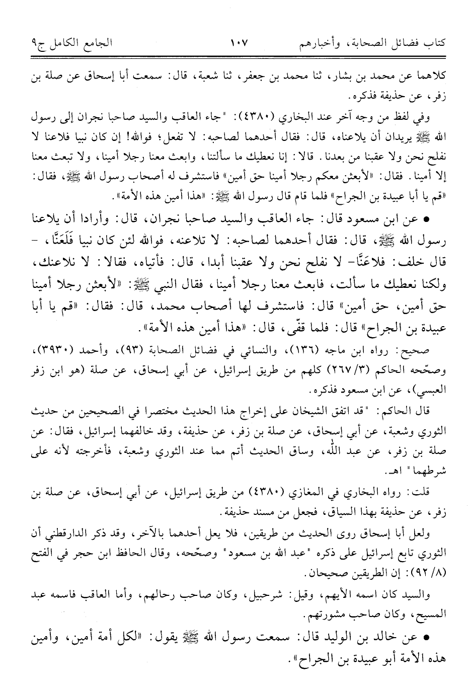 • عن ابن مسعود قال: جاء العاقب والسيد صاحبا نجران، قال: وأرادا أن يلاعنا رسول الله - صلى الله عليه وسلم -، قال: فقال أحدهما لصاحبه: لا تلاعنه، فوالله لئن كان نبيا فَلَعَنَّا، -قال خلف: فلاعَنَّا- لا نفلح نحن ولا عقبنا أبدا، قال: فأتياه، فقالا: لا نلاعنك، ولكنا نعطيك ما سألت، فابعث معنا رجلا أمينا، فقال النبي - صلى الله عليه وسلم -: "لأبعثن رجلا أمينا حق أمين، حق أمين" قال: فاستشرف لها أصحاب محمد، قال: فقال: "قم يا أبا عبيدة بن الجراح" قال: فلما قفّى، قال: "هذا أمين هذه الأمة".