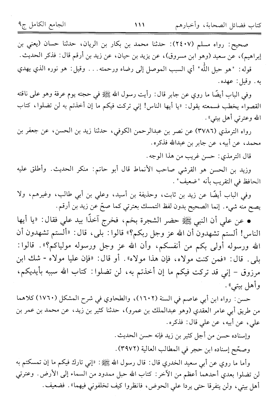 وأما ما روي عن أبي سعيد الخدري قال: قال رسول الله - صلى الله عليه وسلم -: "إني تارك فيكم ما إن تمسكتم به لن تضلوا بعدي أحدهما أعظم من الآخر: كتاب الله حبل ممدود من السماء إلى الأرض. وعترتي أهل بيتي، ولن يتفرقا حتى يردا علي الحوض، فانظروا كيف تخلفوني فيهما". فضعيف.