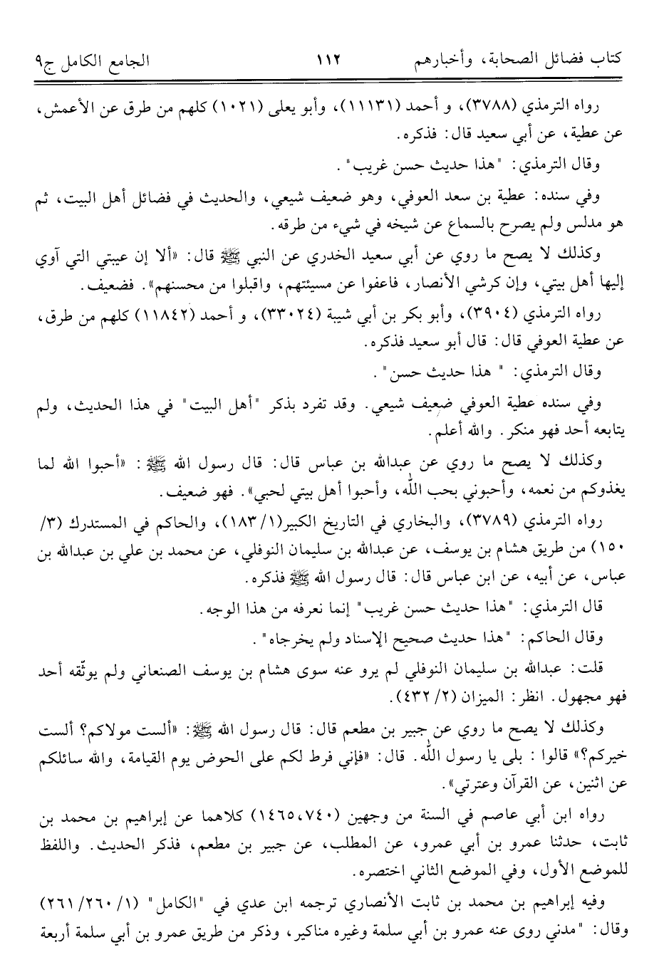 وكذلك لا يصح ما روي عن جبير بن مطعم قال: قال رسول الله - صلى الله عليه وسلم -: "ألست مولاكم؟ ألست خيركم؟ " قالوا: بلى يا رسول الله. قال: "فإني فرط لكم على الحوض يوم القيامة، والله سائلكم عن اثنين، عن القرآن وعترتي".