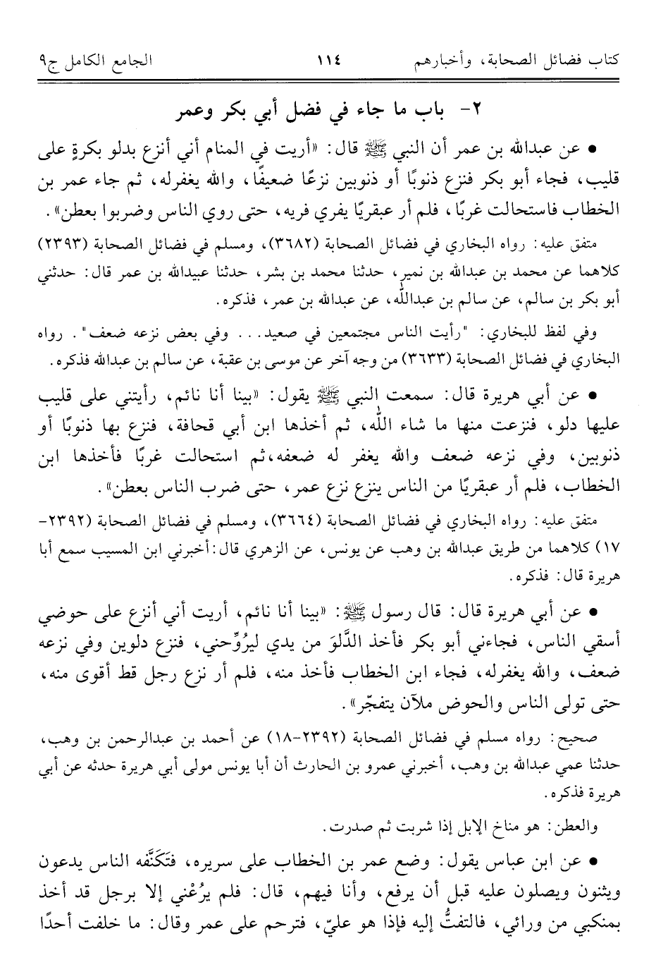 • عن أبي هريرة قال: سمعت النبي - صلى الله عليه وسلم - يقول: "بينا أنا نائم، رأيتني على قليب عليها دلو، فنزعت منها ما شاء الله، ثم أخذها ابن أبي قحافة، فنزع بها ذنوبًا أو ذنوبين، وفي نزعه ضعف والله يغفر له ضعفه، ثم استحالت غربًا فأخذها ابن الخطاب، فلم أر عبقريًا من الناس ينزع نزع عمر، حتى ضرب الناس بعطن".
