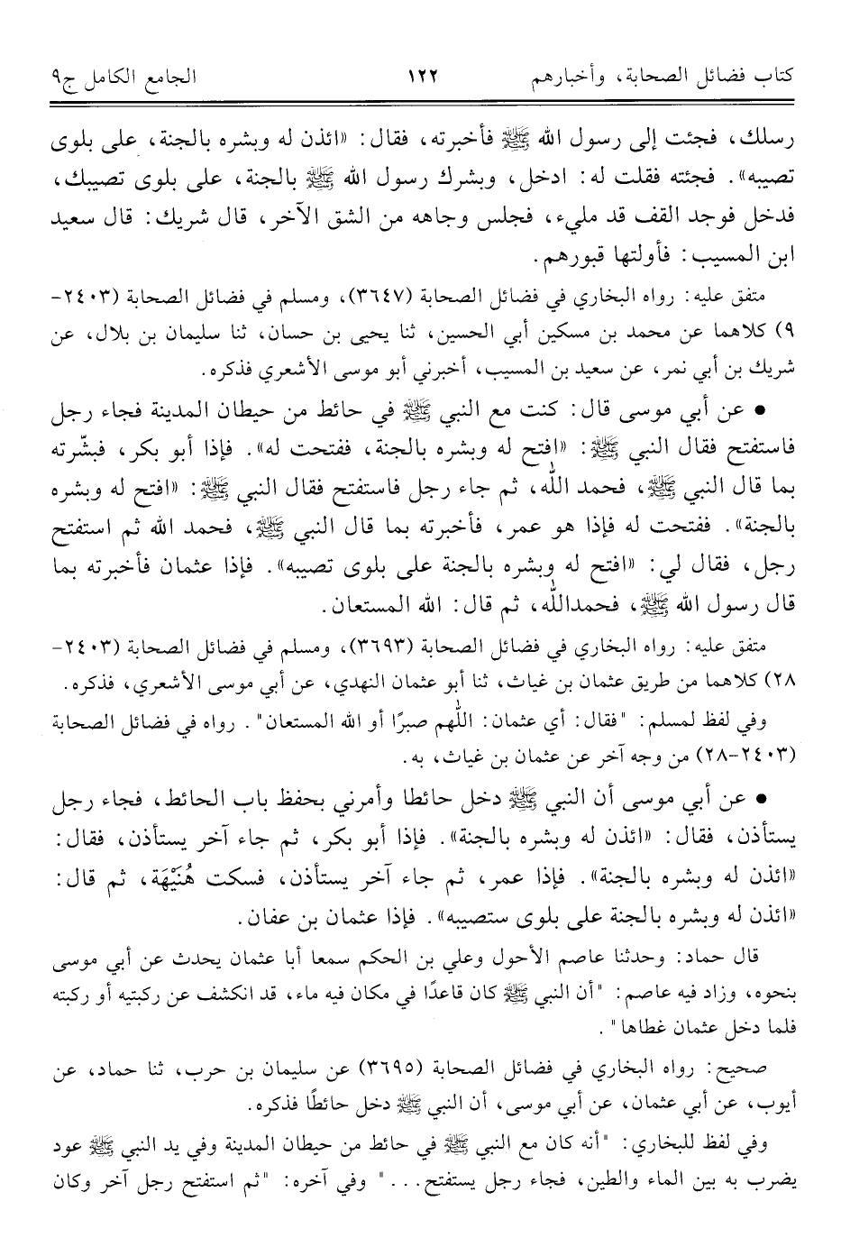 • عن أبي موسى قال: كنت مع النبي - صلى الله عليه وسلم - في حائط من حيطان المدينة فجاء رجل فاستفتح فقال النبي - صلى الله عليه وسلم -: "افتح له وبشره بالجنة، ففتحت له". فإذا أبو بكر، فبشّرته بما قال النبي - صلى الله عليه وسلم - فحمد الله، ثم جاء رجل فاستفتح فقال النبي - صلى الله عليه وسلم -: "افتح له وبشره بالجنة". ففتحت له فإذا هو عمر، فأخبرته بما قال النبي - صلى الله عليه وسلم -، فحمد الله ثم استفتح رجل، فقال لي: "افتح له وبشره بالجنة على بلوى تصيبه". فإذا عثمان فأخبرته بما قال رسول الله - صلى الله عليه وسلم -، فحمد الله، ثم قال: الله المستعان.