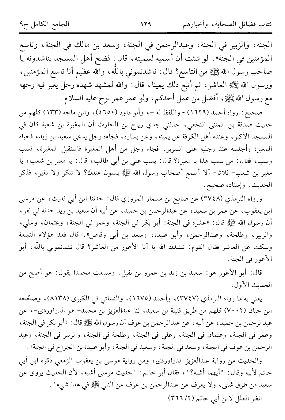 ورواه الترمذي (٣٧٤٨) عن صالح بن مسمار المروزي قال: حدثنا ابن أبي فديك، عن موسى ابن يعقوب، عن عمر بن سعيد، عن عبد الرحمن بن حميد، عن أبيه أن سعيد بن زيد حدثه في نفر، أن رسول الله - صلى الله عليه وسلم - قال: "عشرة في الجنة: أبو بكر في الجنة، وعمر في الجنة، وعثمان، وعلي، والزبير، وطلحة، وعبد الرحمن، وأبو عبيدة، وسعد بن أبي وقاص". قال فعد هؤلاء التسعة وسكت عن العاشر فقال القوم: ننشدك الله يا أبا الأعور من العاشر؟ قال نشدتموني بالله، أبو الأعور في الجنة.