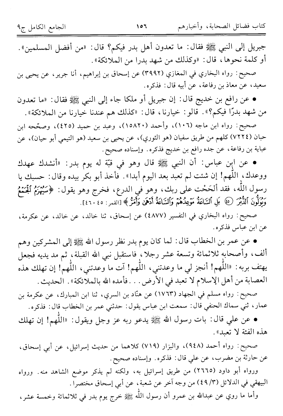 جبريل إلى النبي - صلى الله عليه وسلم - فقال: ما تعدون أهل بدر فيكم؟ قال: "من أفضل المسلمين". أو كلمة نحوها، قال: "وكذلك من شهد بدرا من الملائكة".