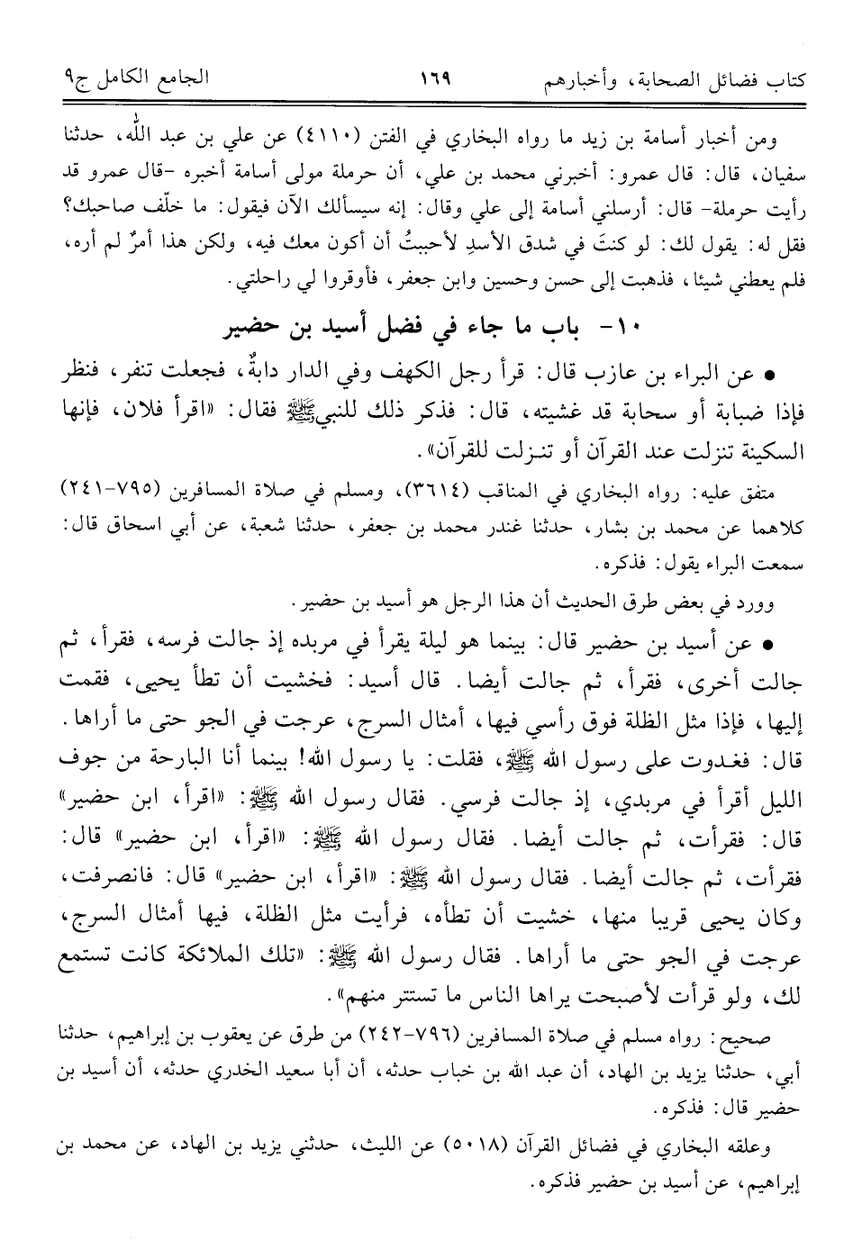 • عن أسيد بن حضير قال: بينما هو ليلة يقرأ في مربده إذ جالت فرسه، فقرأ، ثم جالت أخرى، فقرأ، ثم جالت أيضا. قال أسيد: فخشيت أن تطأ يحيى، فقمت إليها، فإذا مثل الظلة فوق رأسي فيها، أمثال السرج، عرجت في الجو حتى ما أراها. قال: فغدوت على رسول الله - صلى الله عليه وسلم -، فقلت: يا رسول الله! بينما أنا البارحة من جوف الليل أقرأ في مربدي، إذ جالت فرسي. فقال رسول الله - صلى الله عليه وسلم -: "اقرأ، ابن حضير" قال: فقرأت، ثم جالت أيضا. فقال رسول الله - صلى الله عليه وسلم -: "اقرأ، ابن حضير" قال: فقرأت، ثم جالت أيضا. فقال رسول الله - صلى الله عليه وسلم -: "اقرأ، ابن حضير" قال: فانصرفت، وكان يحيى قريبا منها، خشيت أن تطأه، فرأيت مثل الظلة، فيها أمثال السرج، عرجت في الجو حتى ما أراها. فقال رسول الله - صلى الله عليه وسلم -: "تلك الملائكة كانت تستمع لك، ولو قرأت لأصبحت يراها الناس ما تستتر منهم".