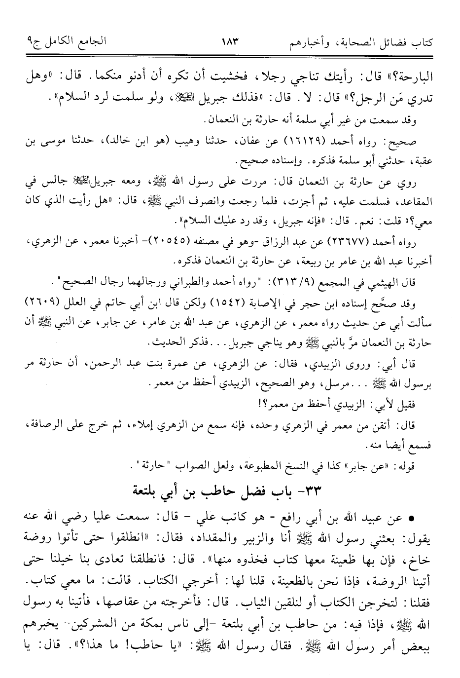 وقد صحَّح إسناده ابن حجر في الإصابة (١٥٤٢) ولكن قال ابن أبي حاتم في العلل (٢٦٠٩) سألت أبي عن حديث رواه معمر، عن الزهري، عن عبد الله بن عامر، عن جابر، عن النبي - صلى الله عليه وسلم - أن حارثة بن النعمان مرَّ بالنبي - صلى الله عليه وسلم - وهو يناجي جبريل ... فذكر الحديث.