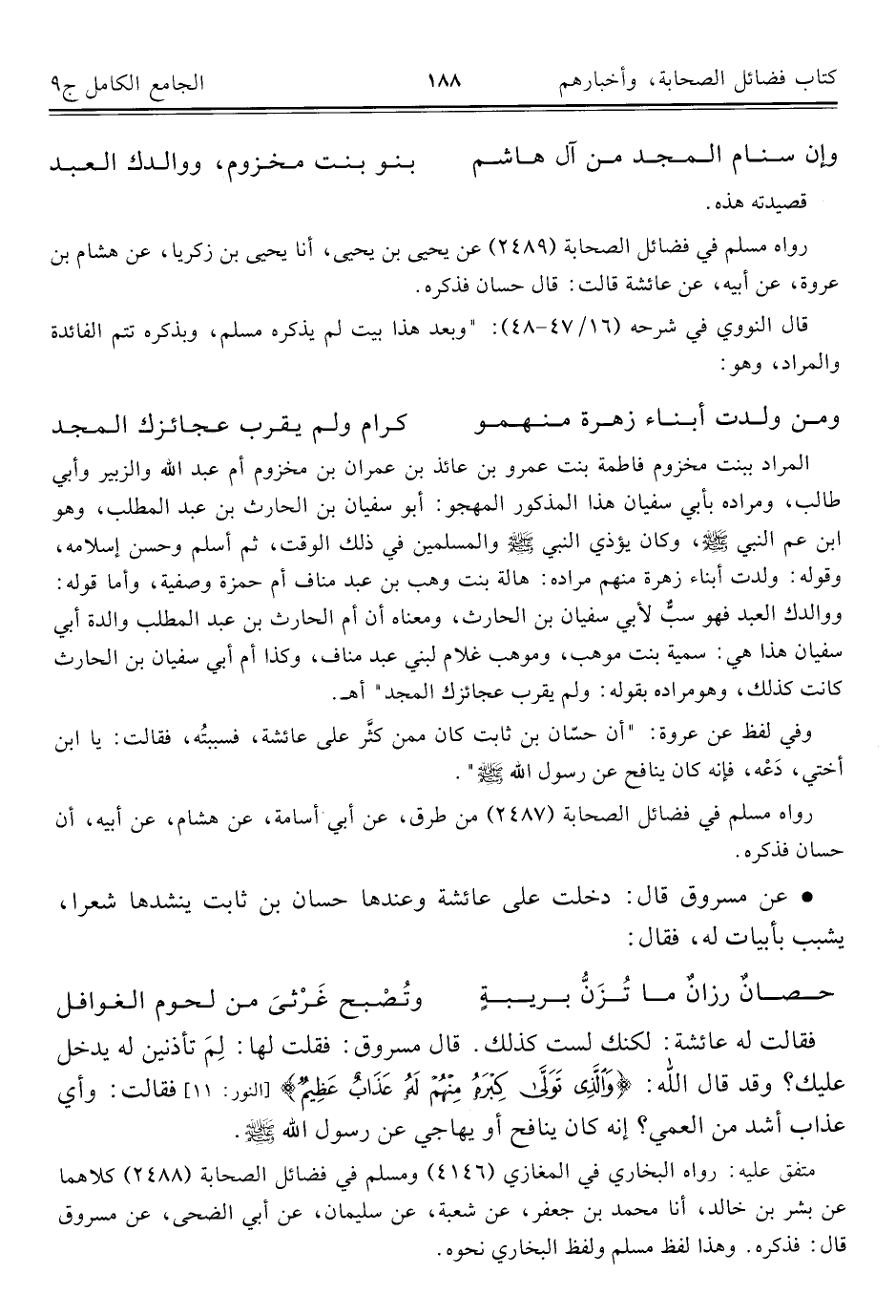 رواه مسلم في فضائل الصحابة (٢٤٨٩) عن يحيى بن يحيى، أنا يحيى بن زكريا، عن هشام بن عروة، عن أبيه، عن عائشة قالت: قال حسان فذكره.