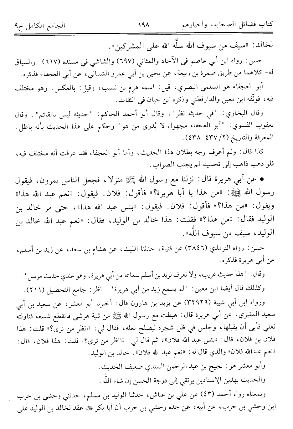 ورواه ابن أبي شيبة (٣٢٩٢٩) عن يزيد بن هارون قال: أخبرنا أبو معشر، عن سعيد بن أبي سعيد المقبري، عن أبي هريرة قال: هبطت مع رسول الله - صلى الله عليه وسلم - من ثنية هرشى فانقطع شسعه فناولته نعلي فأبى أن يقبلها، وجلس في ظل شجرة ليصلح نعله، فقال لي: "انظر من ترى؟ " قلت: هذا فلان بن فلان، قال: "بئس عبد الله فلان"، ثم قال لي: "انظر من ترى؟ " قلت: هذا فلان، قال: "نعم عبد الله فلان" والذي قال له: "نعم عبد الله فلان". خالد بن الوليد.