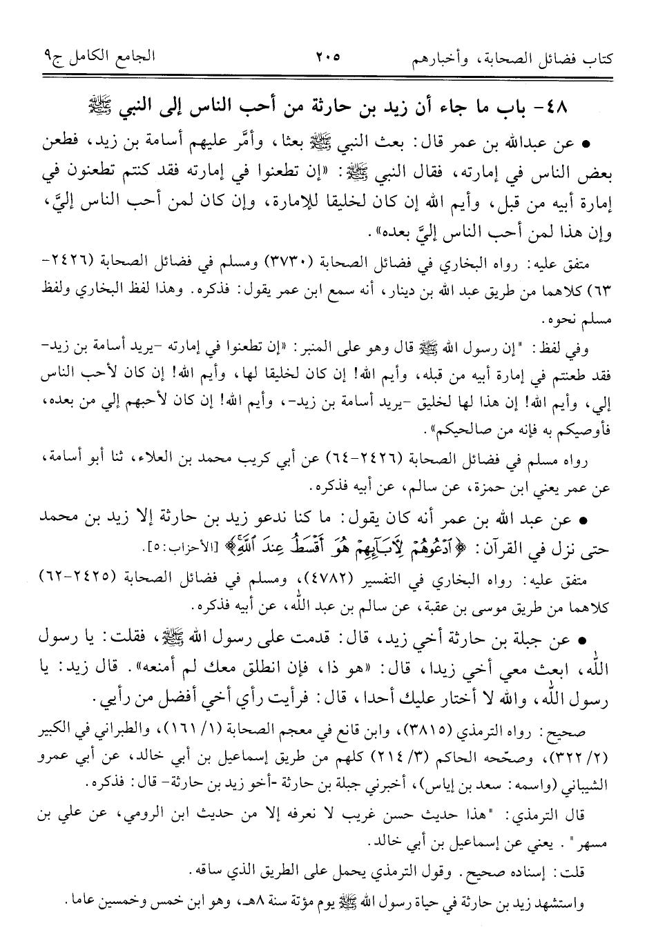 • عن عبد الله بن عمر أنه كان يقول: ما كنا ندعو زيد بن حارثة إلا زيد بن محمد حتى نزل في القرآن: {ادْعُوهُمْ لِآبَائِهِمْ هُوَ أَقْسَطُ عِنْدَ اللَّهِ} [الأحزاب: ٥].
