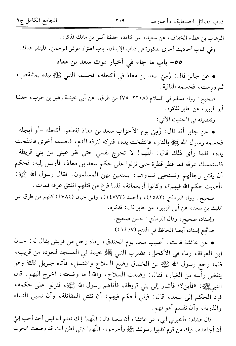 • عن عائشة قالت: أصيب سعد يوم الخندق، رماه رجل من قريش يقال له: حبان بن العرقة، رماه في الأكحل، فضرب النبي - صلى الله عليه وسلم - خيمة في المسجد ليعوده من قريب، فلما رجع رسول الله - صلى الله عليه وسلم - من الخندق وضع السلاح واغتسل، فأتاه جبريل - عليه السلام - وهو ينفض رأسه من الغبار، فقال: وضعت السلاح، والله! ما وضعته، اخرج إليهم. قال النبي - صلى الله عليه وسلم -: "فأين؟ " فأشار إلى بني قريظة، فأتاهم رسول الله - صلى الله عليه وسلم -، فنزلوا على حكمه، فرد الحكم إلى سعد، قال: فإني أحكم فيهم: أن تقتل المقاتلة، وأن تسبى النساء والذرية، وأن تقسم أموالهم.