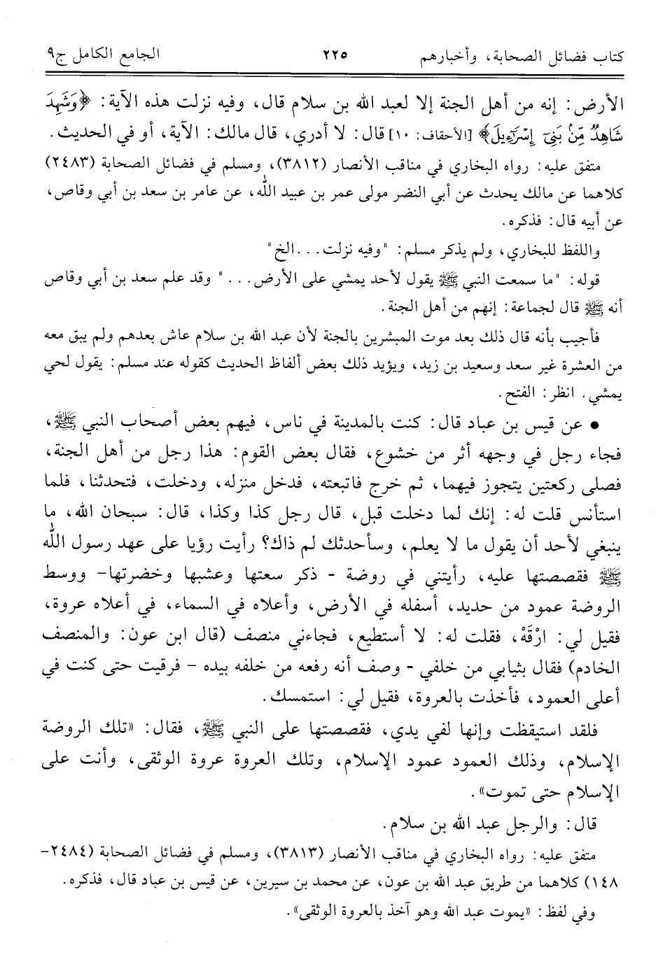 فلقد استيقظت وإنها لفي يدي، فقصصتها على النبي - صلى الله عليه وسلم -، فقال: "تلك الروضة الإسلام، وذلك العمود عمود الإسلام، وتلك العروة عروة الوثقى، وأنت على الإسلام حتى تموت".