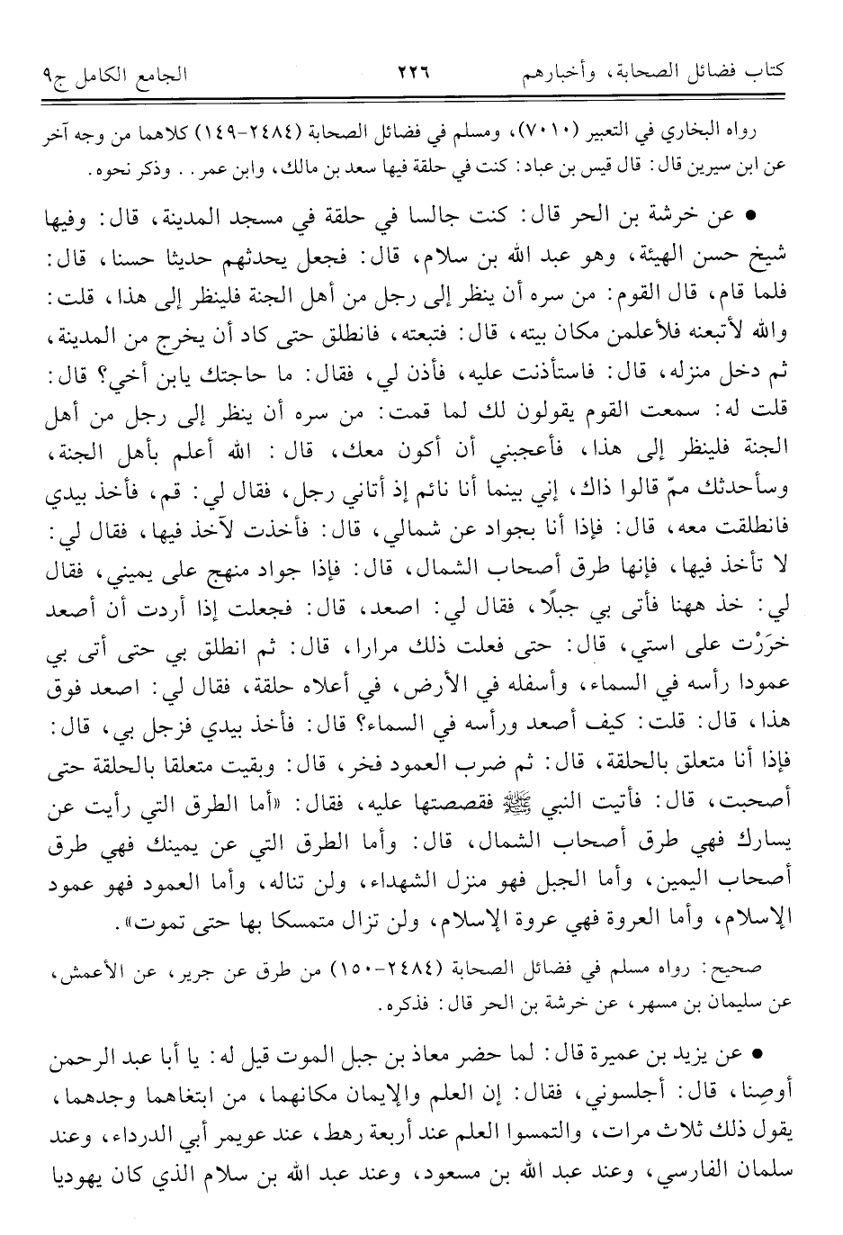 • عن خرشة بن الحر قال: كنت جالسا في حلقة في مسجد المدينة، قال: وفيها شيخ حسن الهيئة، وهو عبد الله بن سلام، قال: فجعل يحدثهم حديثا حسنا، قال: فلما قام، قال القوم: من سره أن ينظر إلى رجل من أهل الجنة فلينظر إلى هذا، قلت: والله لأتبعنه فلأعلمن مكان بيته، قال: فتبعته، فانطلق حتى كاد أن يخرج من المدينة، ثم دخل منزله، قال: فاستأذنت عليه، فأذن لي، فقال: ما حاجتك يابن أخي؟ قال: قلت له: سمعت القوم يقولون لك لما قمت: من سره أن ينظر إلى رجل من أهل الجنة فلينظر إلى هذا، فأعجبني أن أكون معك، قال: الله أعلم بأهل الجنة، وسأحدثك ممّ قالوا ذاك، إني بينما أنا نائم إذ أتاني رجل، فقال لي: قم، فأخذ بيدي فانطلقت معه، قال: فإذا أنا بجواد عن شمالي، قال: فأخذت لآخذ فيها، فقال لي: لا تأخذ فيها، فإنها طرق أصحاب الشمال، قال: فإذا جواد منهج على يميني، فقال لي: خذ ههنا فأتى بي جبلًا، فقال لي: اصعد، قال: فجعلت إذا أردت أن أصعد خرَرْت على استي، قال: حتى فعلت ذلك مرارا، قال: ثم انطلق بي حتى أتى بي عمودا رأسه في السماء، وأسفله في الأرض، في أعلاه حلقة، فقال لي: اصعد فوق هذا، قال: قلت: كيف أصعد ورأسه في السماء؟ قال: فأخذ بيدي فزجل بي، قال: فإذا أنا متعلق بالحلقة، قال: ثم ضرب العمود فخر، قال: وبقيت متعلقا بالحلقة حتى أصحبت، قال: فأتيت النبي - صلى الله عليه وسلم - فقصصتها عليه، فقال: "أما الطرق التي رأيت عن يسارك فهي طرق أصحاب الشمال، قال: وأما الطرق التي عن يمينك فهي طرق أصحاب اليمين، وأما الجبل فهو منزل الشهداء، ولن تناله، وأما العمود فهو عمود الإسلام، وأما العروة فهي عروة الإسلام، ولن تزال متمسكا بها حتى تموت".