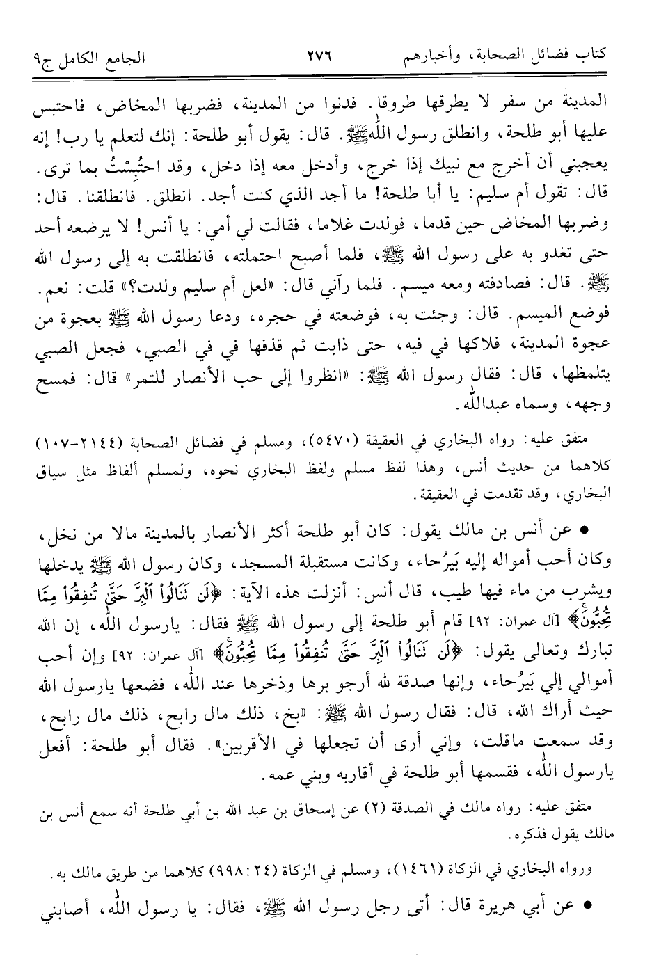 • عن أنس بن مالك يقول: كان أبو طلحة أكثر الأنصار بالمدينة مالا من نخل، وكان أحب أمواله إليه بَيرُحاء، وكانت مستقبلة المسجد، وكان رسول الله - صلى الله عليه وسلم - يدخلها ويشرب من ماء فيها طيب، قال أنس: أنزلت هذه الآية: {لَنْ تَنَالُوا الْبِرَّ حَتَّى تُنْفِقُوا مِمَّا تُحِبُّونَ} [آل عمران: ٩٢] قام أبو طلحة إلى رسول الله - صلى الله عليه وسلم - فقال: يا رسول الله، إن الله تبارك وتعالى يقول: {لَنْ تَنَالُوا الْبِرَّ حَتَّى تُنْفِقُوا مِمَّا تُحِبُّونَ} [آل عمران: ٩٢] وإن أحب أموالي إلي بَيرُحاء، وإنها صدقة لله أرجو برها وذخرها عند الله، فضعها يا رسول الله حيث أراك الله، قال: فقال رسول الله - صلى الله عليه وسلم -: "بخ، ذلك مال رابح، ذلك مال رابح، وقد سمعت ما قلت، وإني أرى أن تجعلها في الأقربين". فقال أبو طلحة: أفعل يا رسول الله، فقسمها أبو طلحة في أقاربه وبني عمه.