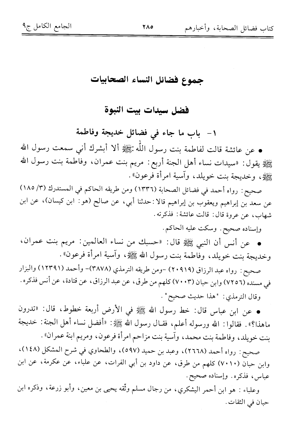 ١ - باب ما جاء في فضائل خديجة وفاطمة