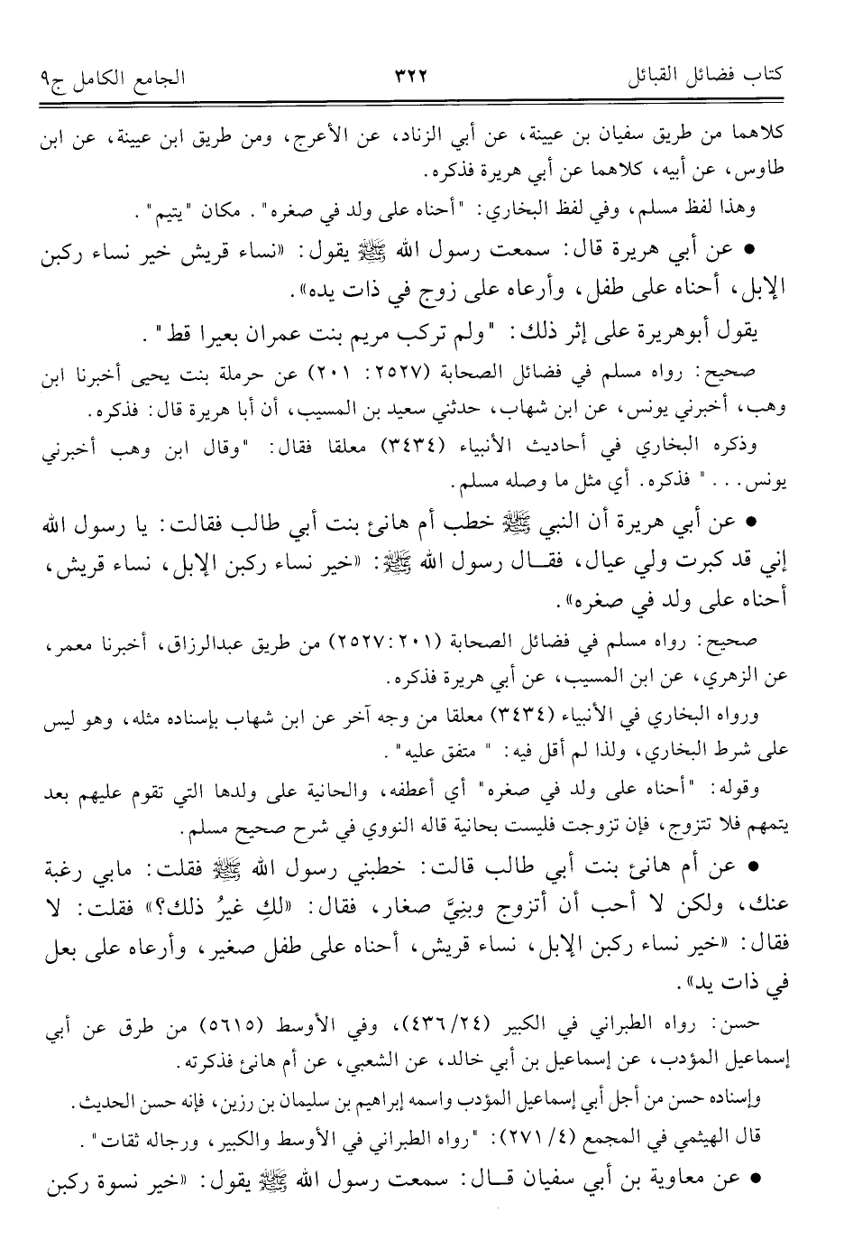 • عن أبي هريرة أن النبي - صلى الله عليه وسلم - خطب أم هانئ بنت أبي طالب فقالت: يا رسول الله إني قد كبرت ولي عيال، فقال رسول الله - صلى الله عليه وسلم -: "خير نساء ركبن الإبل، نساء قريش، أحناه على ولد في صغره".