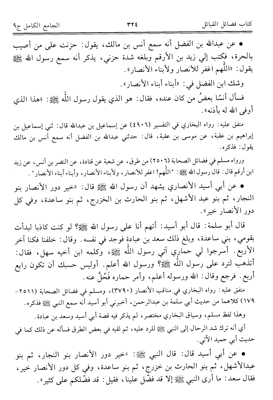 • عن أبي أسيد الأنصاري يشهد أن رسول الله - صلى الله عليه وسلم - قال: "خير دور الأنصار بنو النجار، ثم بنو عبد الأشهل، ثم بنو الحارث بن الخزرج، ثم بنو ساعدة، وفي كل دور الأنصار خير".