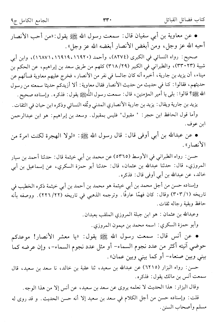 • عن معاوية بن أبي سفيان قال: سمعت رسول الله - صلى الله عليه وسلم - يقول: "من أحب الأنصار أحبه الله عز وجل، ومن أبغض الأنصار أبغضه الله عز وجل".